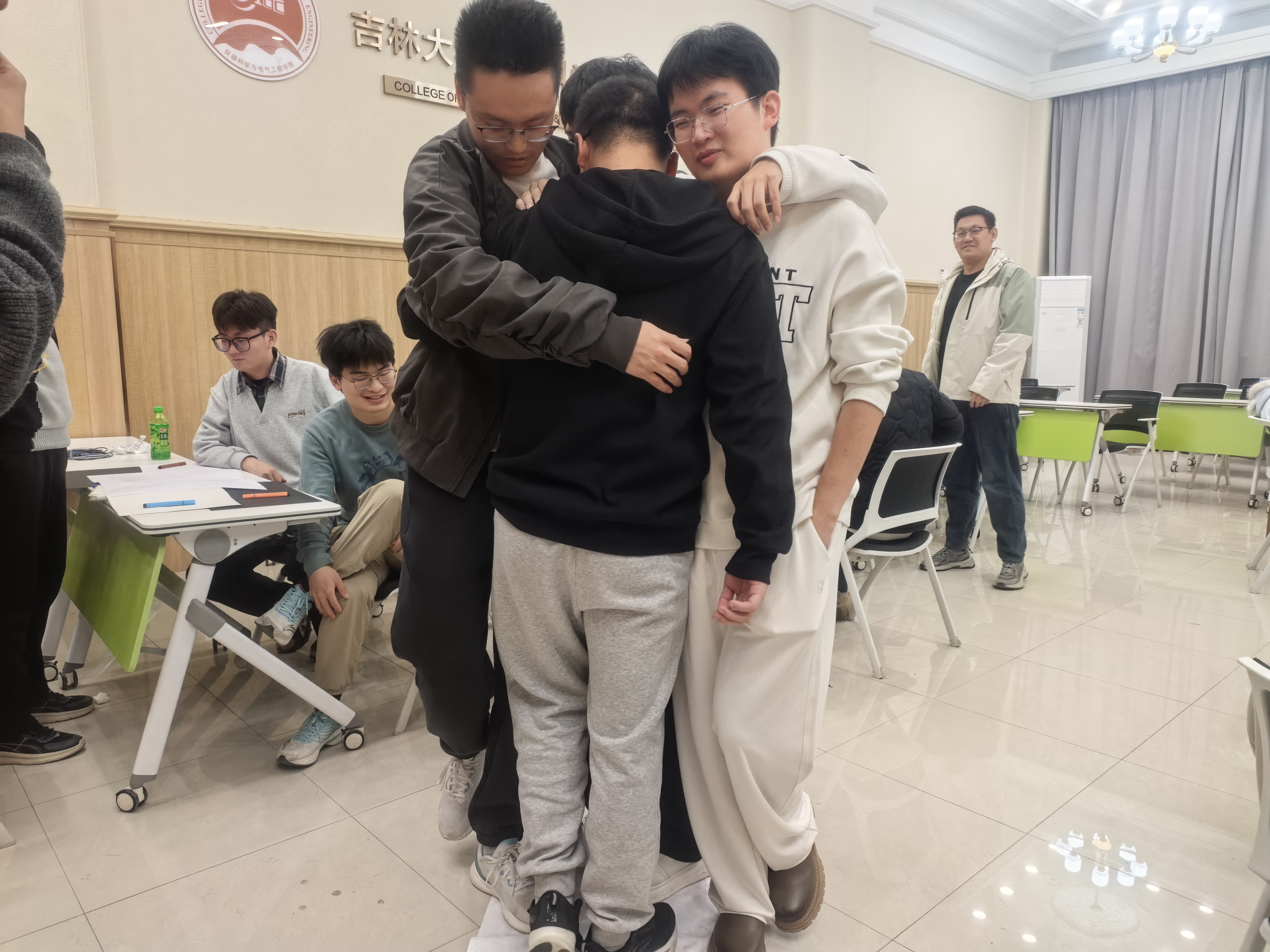 最具挑战性的“同舟共济”环节将整个活动推向高潮。各小组需要让全体成员站在一张A2纸上,所有人的脚都不能超出纸的边界。在3分钟的讨论时间里,同学们集思广益,想出了各种站位和配合方案。挑战过程中笑声不断,有人提议“互相支撑”,有人建议“大家抱紧”。随着纸张从A2折叠到A3,难度不断升级,但同学们依然没有放弃,在一次次调整和尝试中,多个小组最终成功完成了挑战。这个活动让大家深刻体会到,团队需要个性、需要共识,更需要和而不同、协调合作。