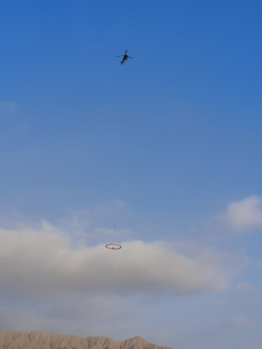 直升机航空电磁探测团队,针对策大雅隧道洞址勘查的高落差、大深度、精细化、超长长度的要求,在自主研发的航空混场源电磁探测系统基础上,以直升机为飞行平台,发明了电性源与磁性源结合、人工源与天然源结合,并优化系统性能参数的航空混场源电磁探测技术,团队克服了地形、天气、交通等多种不利因素影响,经过近一个月的艰苦奋战,探测结果很好的兼顾了探测深度和探测精度,为隧道施工提供了全长度的精细电阻率结构刻画。