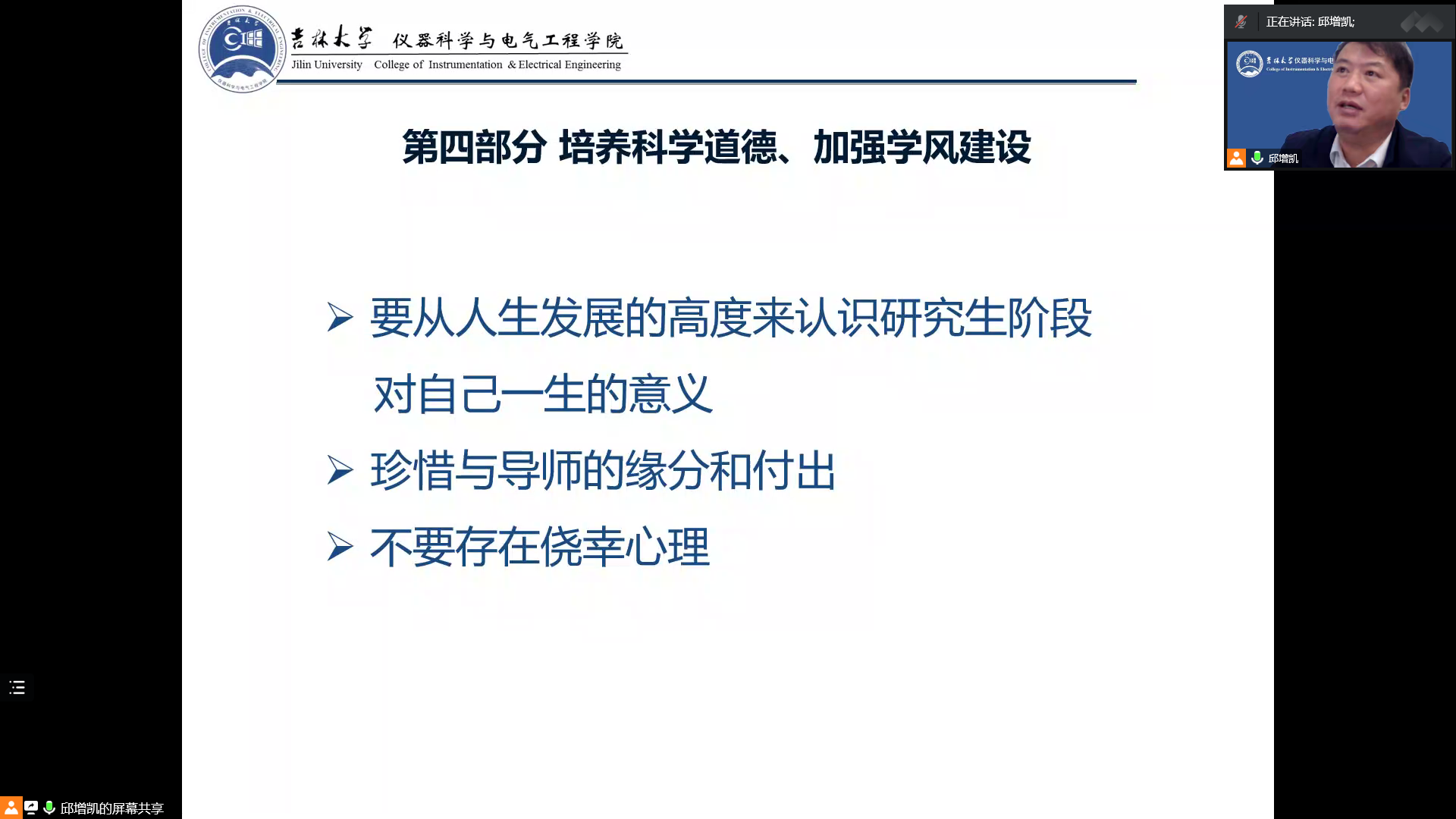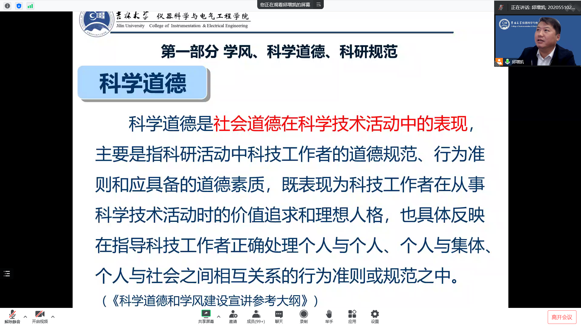 于2022年9月22日晚上18:00在线上腾讯会议组织开展以“严守科学道德,坚定理想信念,远离学术不端”为主题的学风建设讲座活动,活动由研究生辅导员周琪老师主持,党委书记邱增凯教授主讲,2022级博士、硕士研究生新生全体参加。