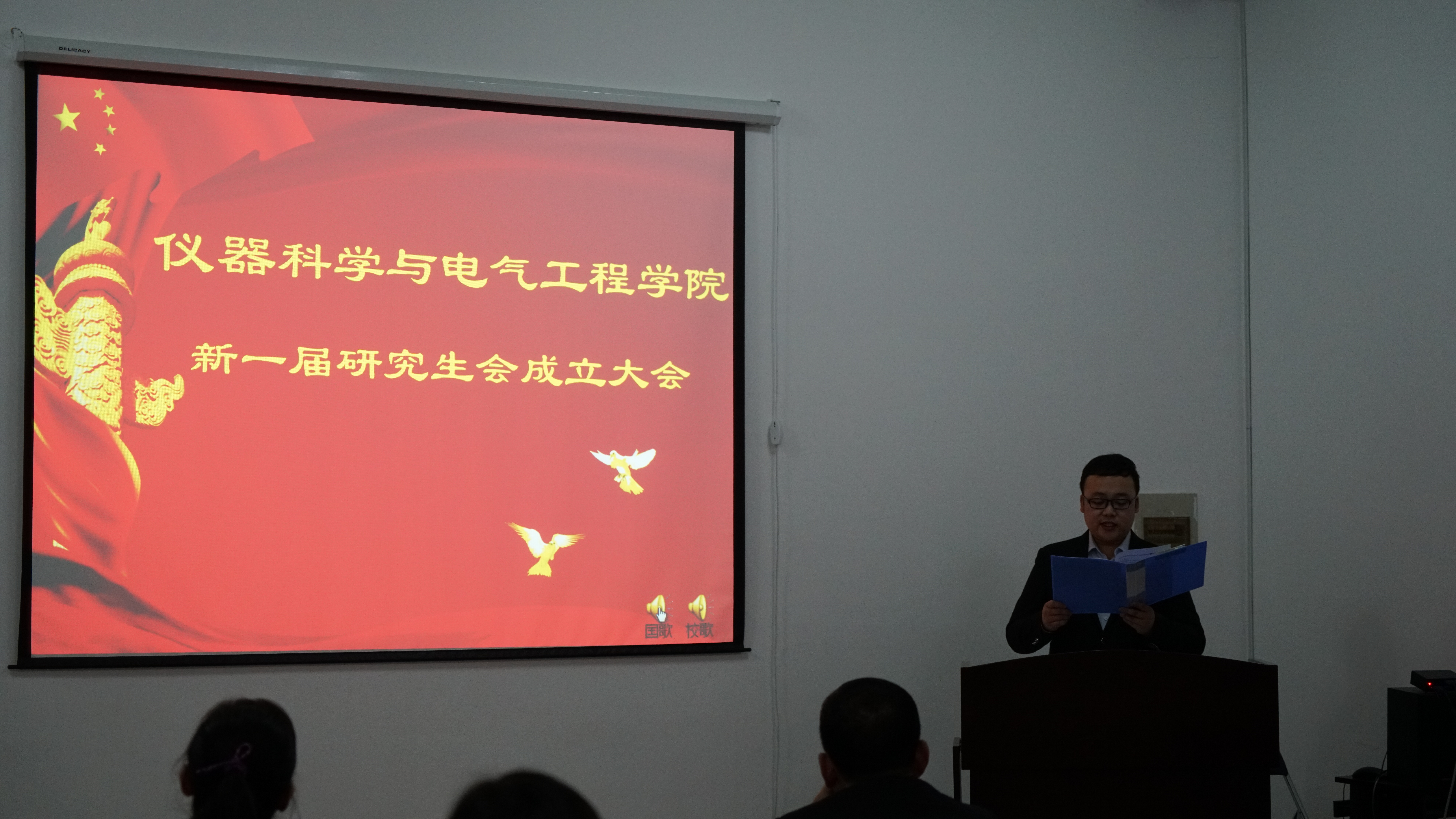 学院党委书记王爱民、副院长嵇艳鞠、党委副书记邱增凯和院团委书记张昊宇出席成立大会。下午1:30分,伴随着雄壮激昂的国歌声,会议在院党委副书记邱增凯老师的主持下拉开序幕。