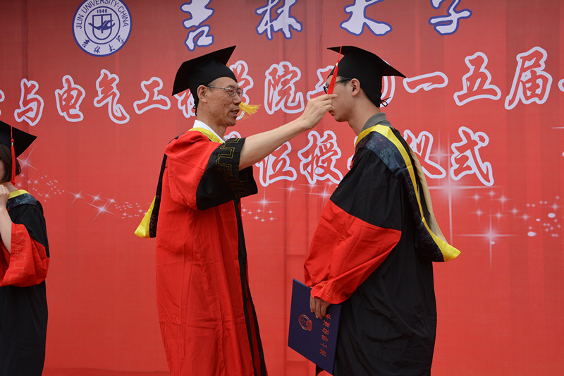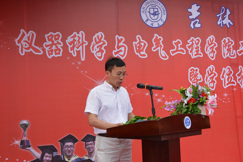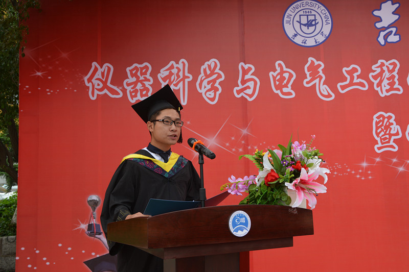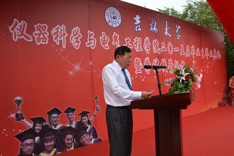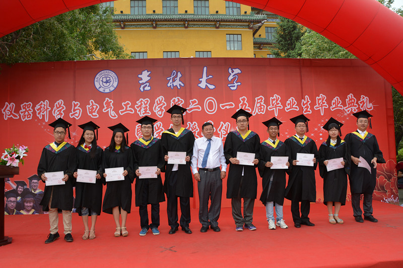 2015届研究生毕业生和本科毕业生名单,院长林君教授与院学科学位委员会副主席嵇艳鞠教授一起为2015届毕业生授予学位。随后,院党委书记余国友教授宣读了2015届校优秀毕业生名单,并为优秀毕业生颁发获奖证书、合影留念。学院教学委员会主任王应吉教授宣读了优秀毕业论文名单,仪器系主任凌振宝教授、电气系主任刘长胜副教授分别为获得优秀毕业论文的同学颁发证书并合影留念。之后,教师代表王应吉教授和2015届毕业生代表、一色