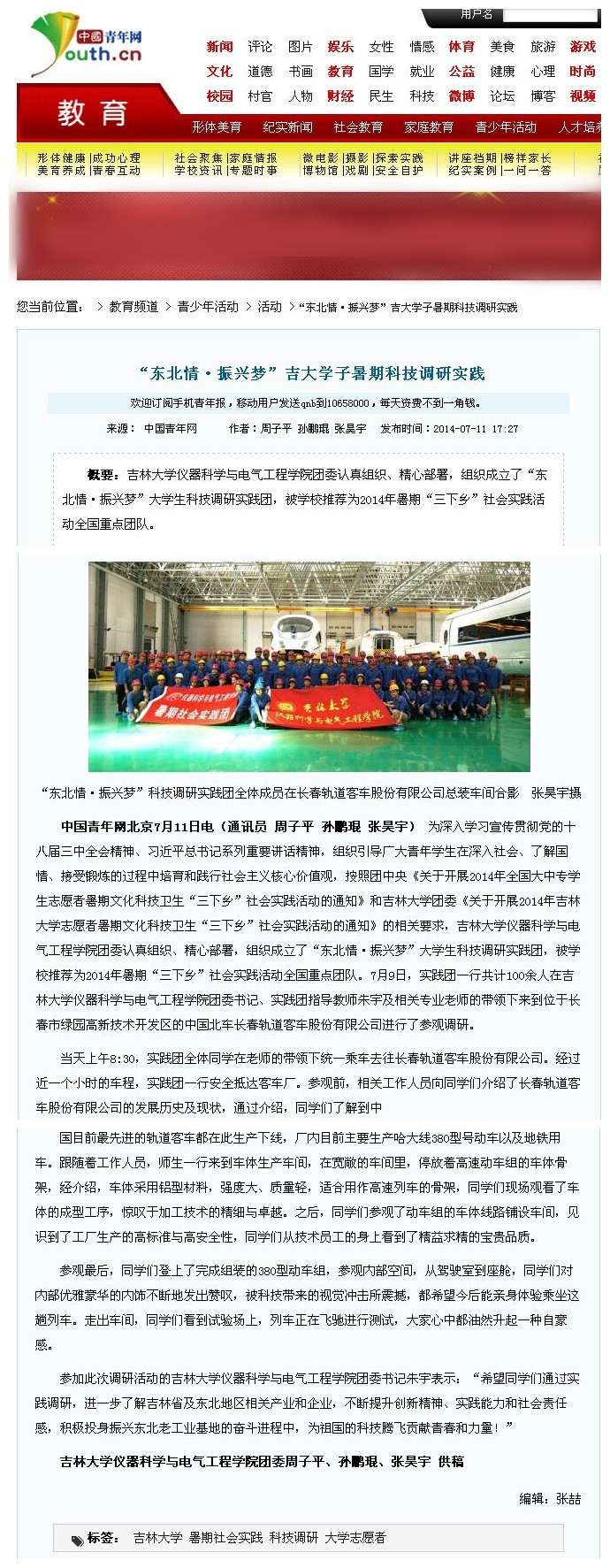 “东北情·振兴梦”实践团开展的中国北车长春轨道客车股份有限公司科技调研活动受到了共青团中央主办的中央重点新闻网站——中国青年网的关注报道,中国青年网于7月11日以《“东北情·振兴梦”吉大学子暑期科技调研实践》为题做了详细介绍。