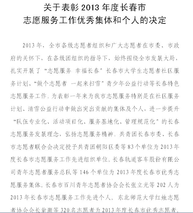 团委被评为“长春市先进(基层)团委”,院团委书记朱宇被评为“优秀基层团干部”;在共青团长春市委、长春市志愿者联合会下发的《关于表彰2013年度长春市志愿服务工作优秀集体和个人的决定》中,一色
