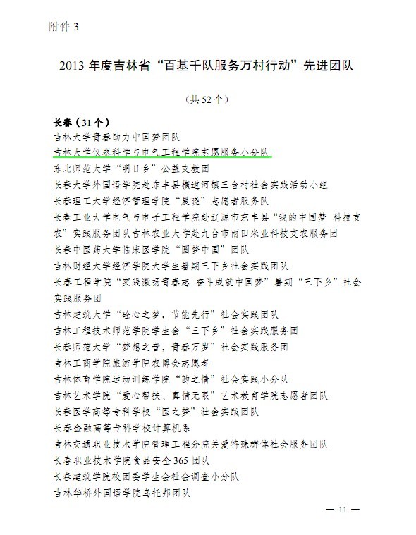 在中共吉林省委宣传部、吉林省文明办、吉林省教育厅、共青团吉林省委、吉林省学生联合会联合下发的《关于表彰2013年吉林省大中专学生志愿者暑期“三下乡”社会实践活动暨“百基千队服务万村行动”先进集体和个人的决定》中,一色