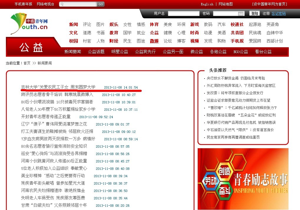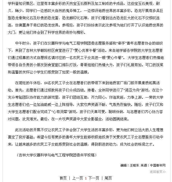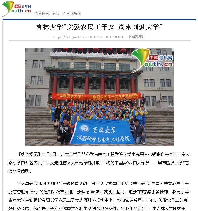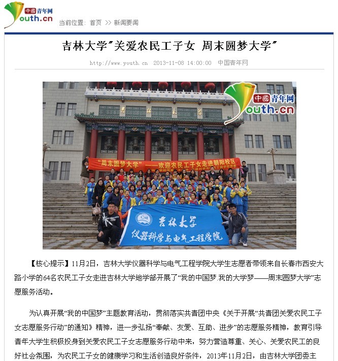 “关爱农民工子女 周末圆梦大学”》为题对此次活动进行了详细报道。中国青年网由共青团中央主办,是国内最大的青年主流网站。此次活动是继2013年8月6日中国青年网以《一色