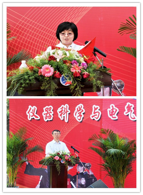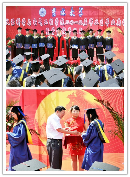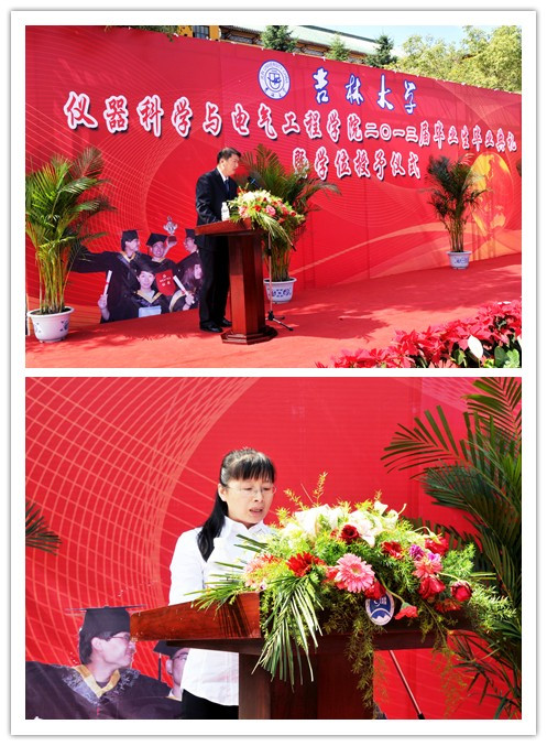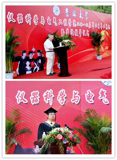 2013届研究生毕业生和本科毕业生名单,院长林君教授与院学位委员会主任田地教授一起为2013届毕业生授予学位。随后,院党委书记余国友教授宣读了2013届校、院优秀毕业生名单,并为优秀毕业生颁发获奖证书、合影留念。学院教学委员会主任王应吉教授宣读了优秀毕业论文名单,仪器系主任凌振宝教授、电气系主任刘长胜副教授分别为获得优秀毕业论文的同学颁发证书并合影留念。之后,教师代表朱凯光教授和2013届毕业生代表、一色
