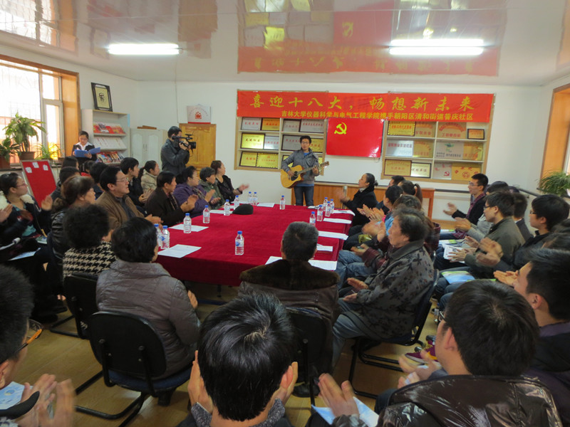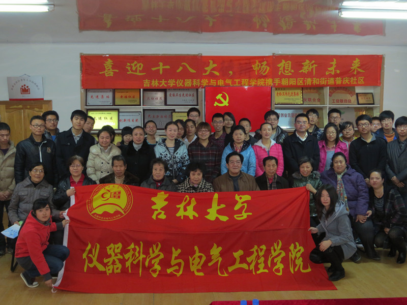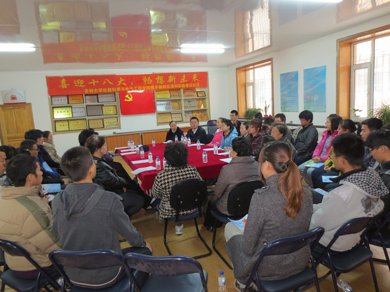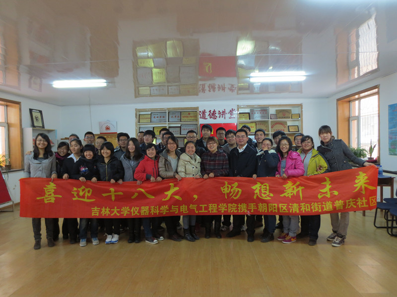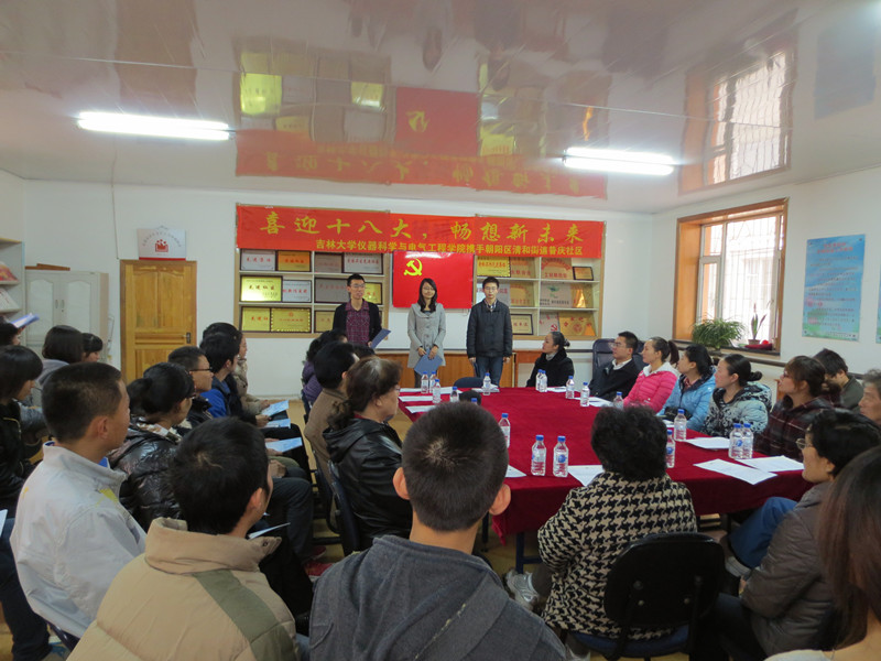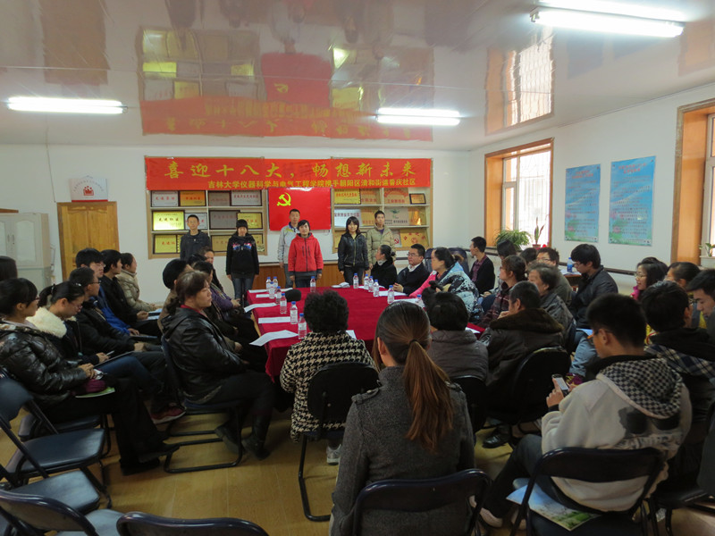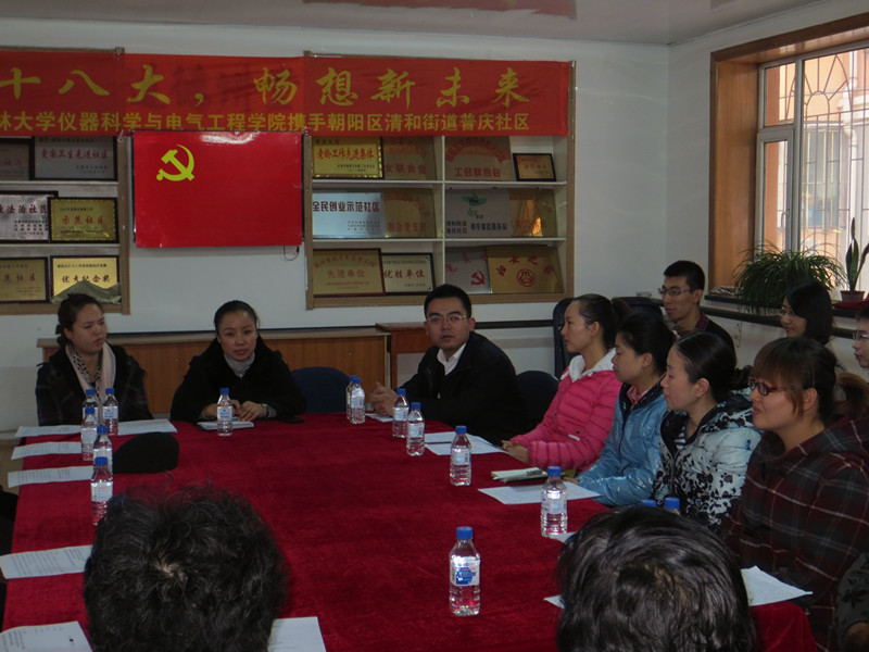 团委携手长春市朝阳区清和街道普庆社区党委在十八大召开前夕2012年11月7日上午在清和街道普庆社区会议活动室举办了以“喜迎十八大,畅想新未来”为主题的青年学子与新老党员座谈活动。清和街道党办主任王群宝、街道精神文明办副主任肖帅颖、街道团工委书记张晶、一色
