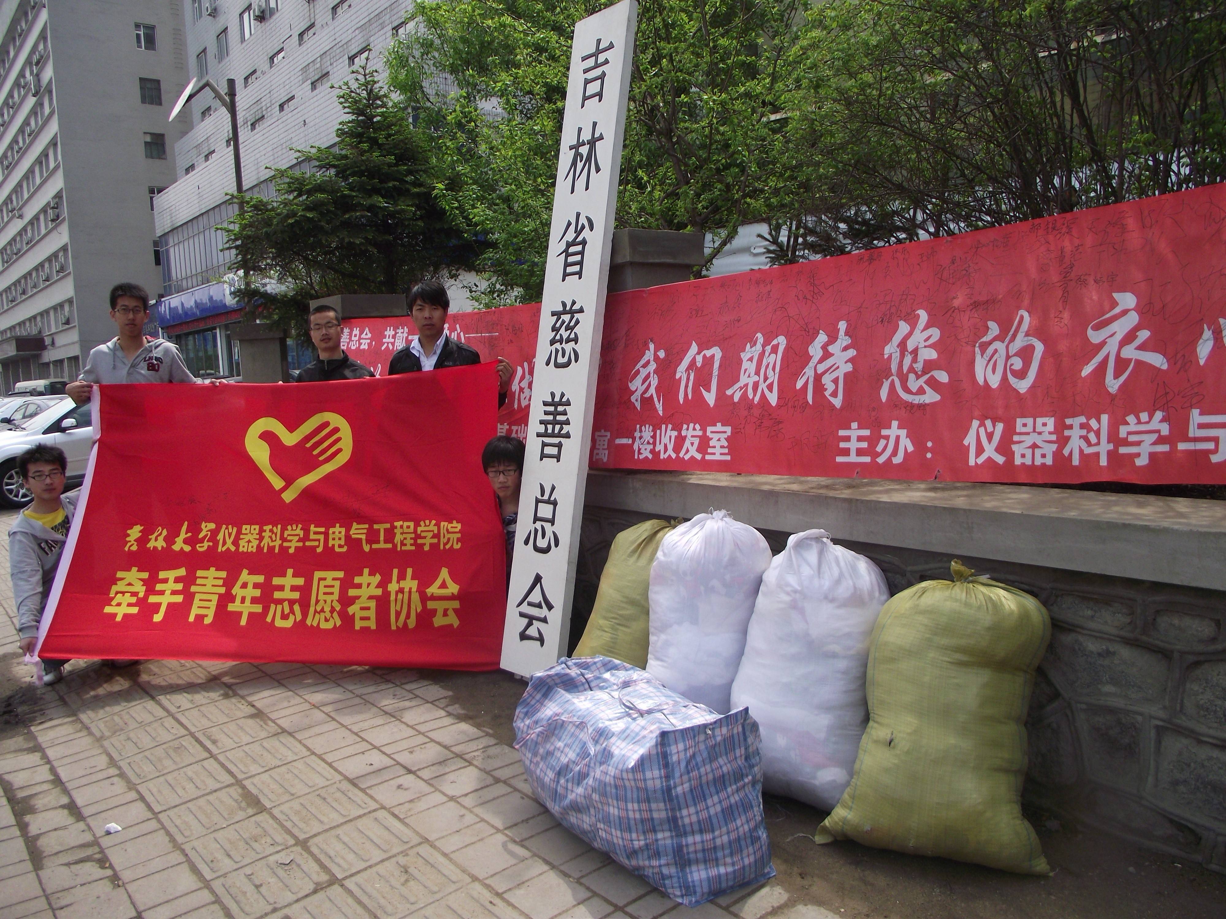 仪器科学与电气工程学院团委、“牵手”青年志愿者协会携手吉林省慈善总会于2012年5月4日至5月11日在中心校区开展了“细微的爱,从衣做起”——爱心衣物捐赠活动。经过一周的爱心捐赠,活动最终募捐得衣物10大包,共计600余件。2012年5月14日上午,此次爱心捐赠活动的组织者们将爱心衣物全部送往吉林省慈善总会,受到慈善总会工作人员的热情接待和高度赞赏。