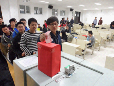 捐款活动在18:30正式开始,2011级一班班长关钊同学首先代表因事未能到场的2011级学生辅导员朱宇老师向同学们简要介绍了张祥帅同学的基本情况,并向学院2011级全体同学宣读了捐助倡议书。随后,2011级同学依次来到捐款箱前,将自己的一份爱心捐献给需要帮助的张祥帅同学。整个捐款过程,同学们井然有序、积极踊跃,很好地展示了90后大学生们的精神风貌。短短半个小时的捐款活动共收到2011级学生捐款6235元。
