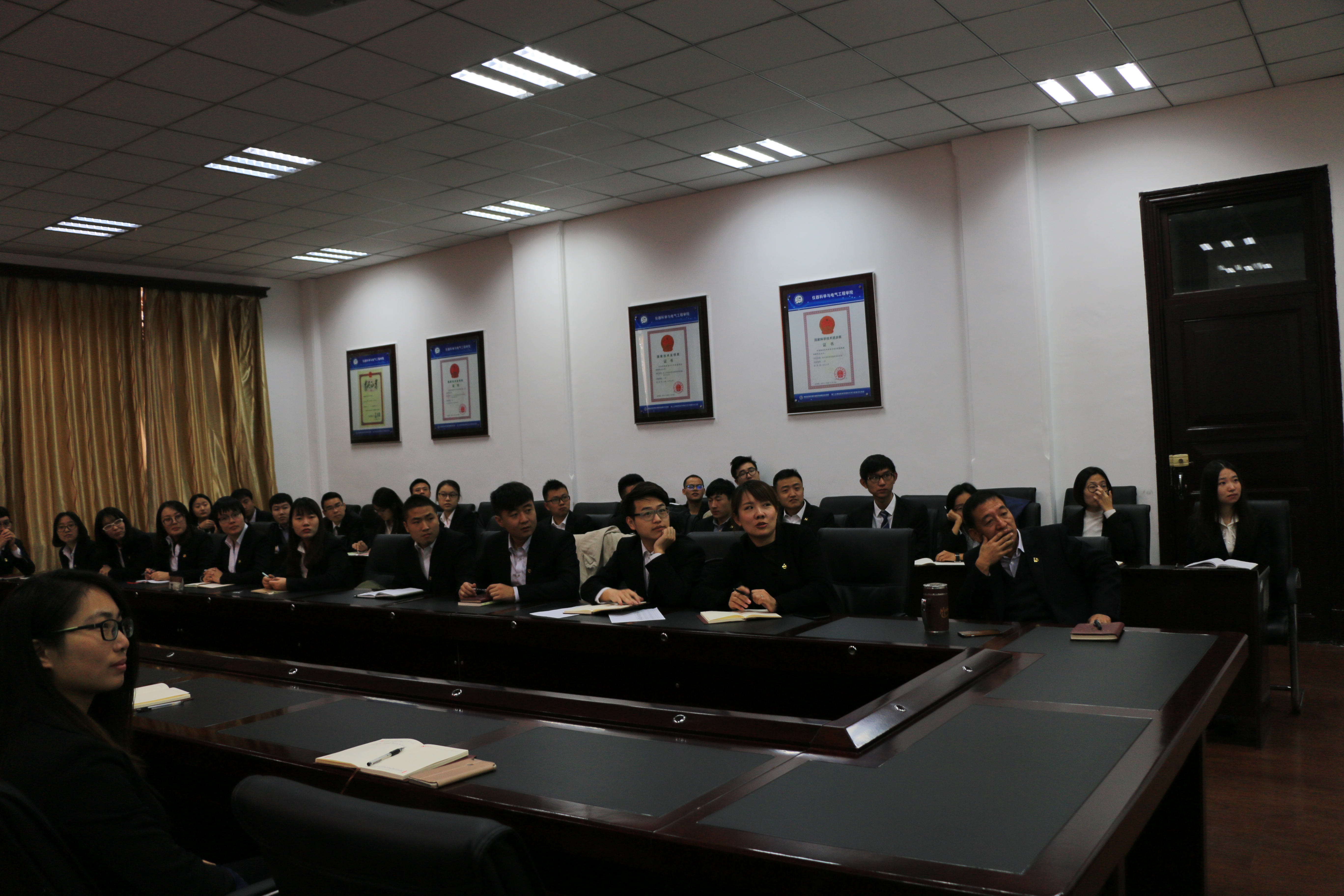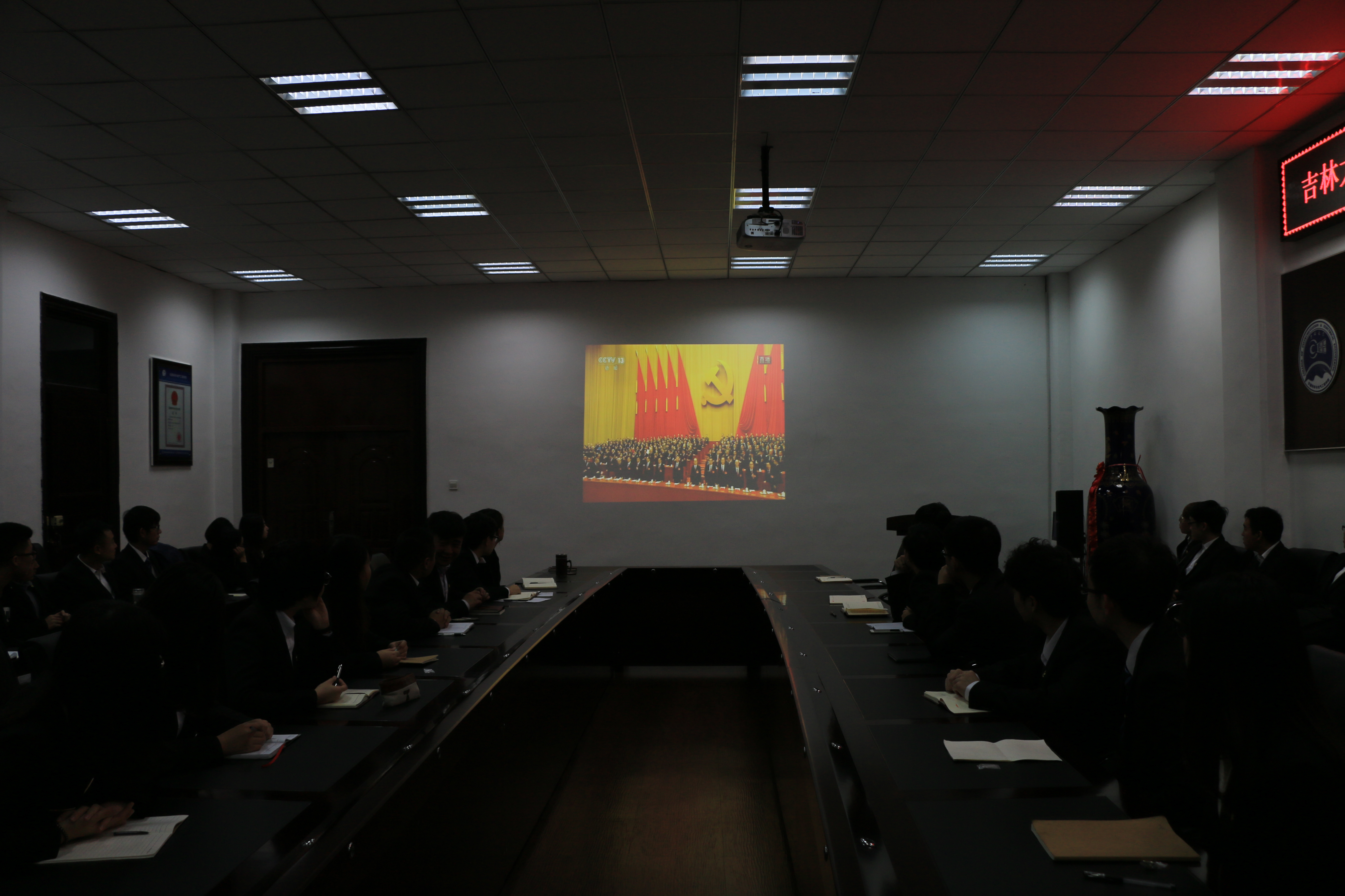 学院师生身着正装,党员佩戴党徽,怀着激动和振奋的心情,一起收看党的十九大开幕盛况,认真聆听习近平总书记代表第十八届中央委员会向大会作报告。党的十九大这一牵动亿万人民的伟大盛会让收看师生聚精会神,全身心的投入到习近平总书记的报告中。收看期间,一色
