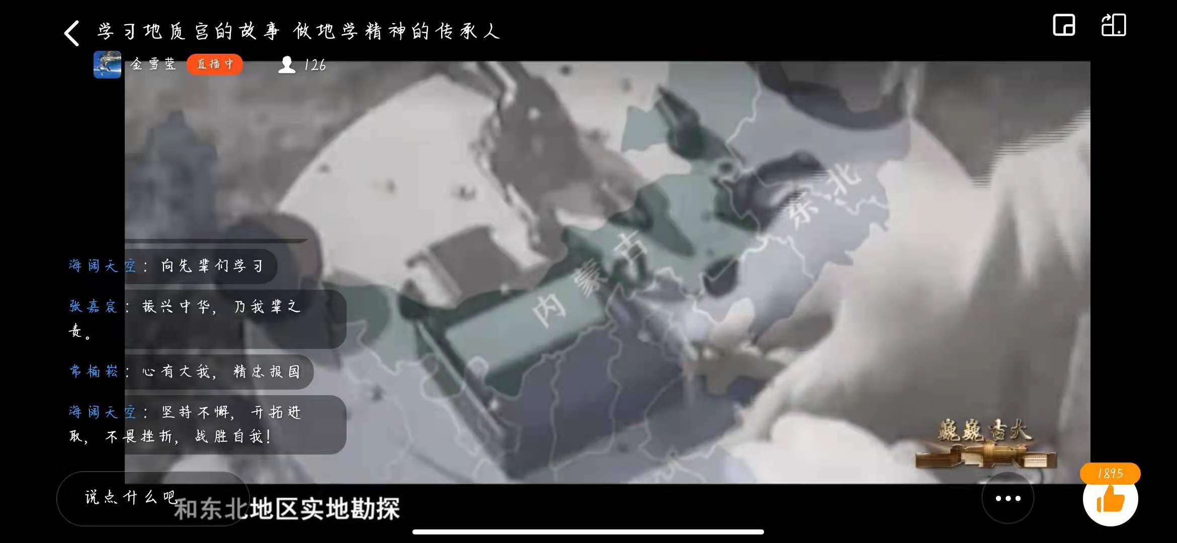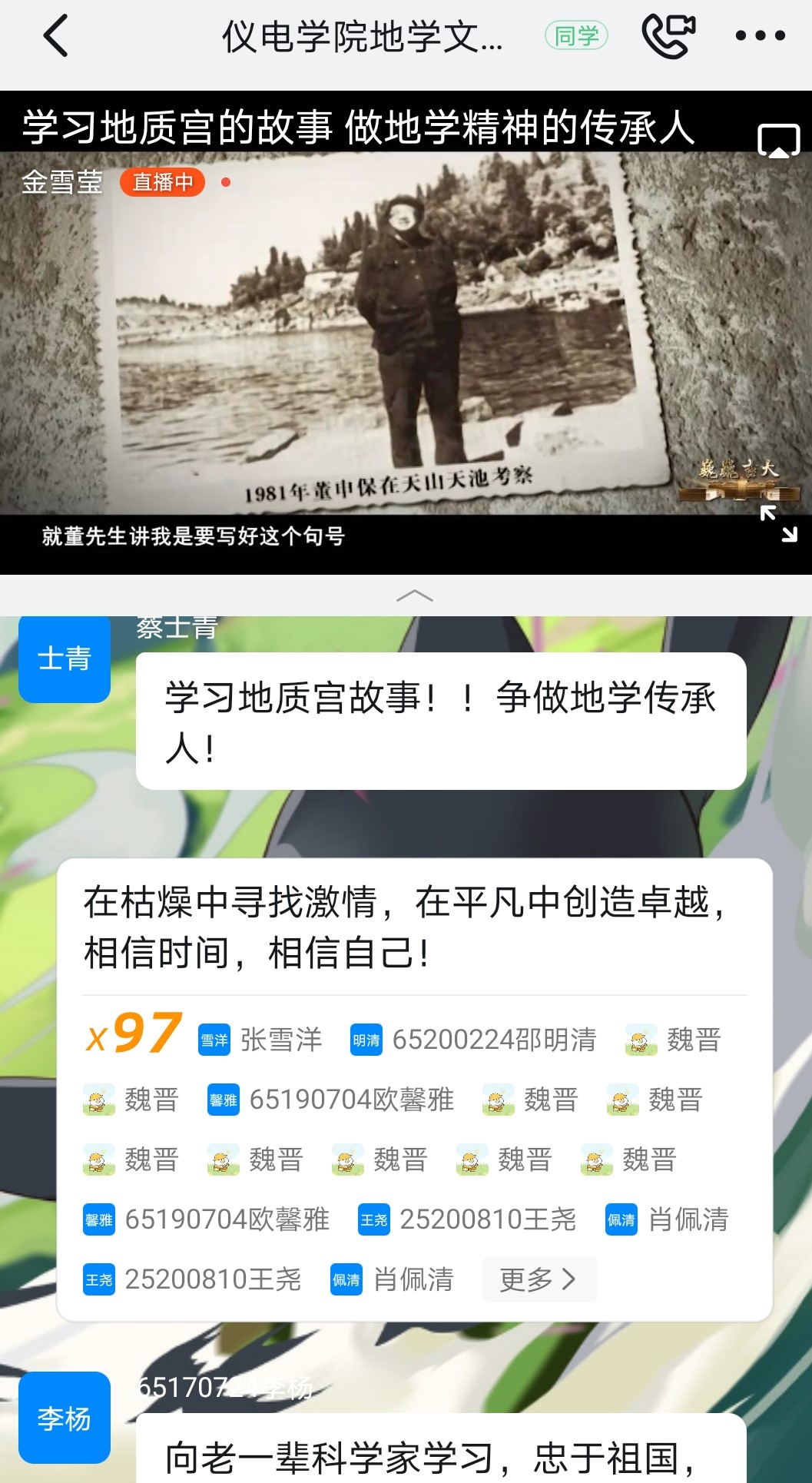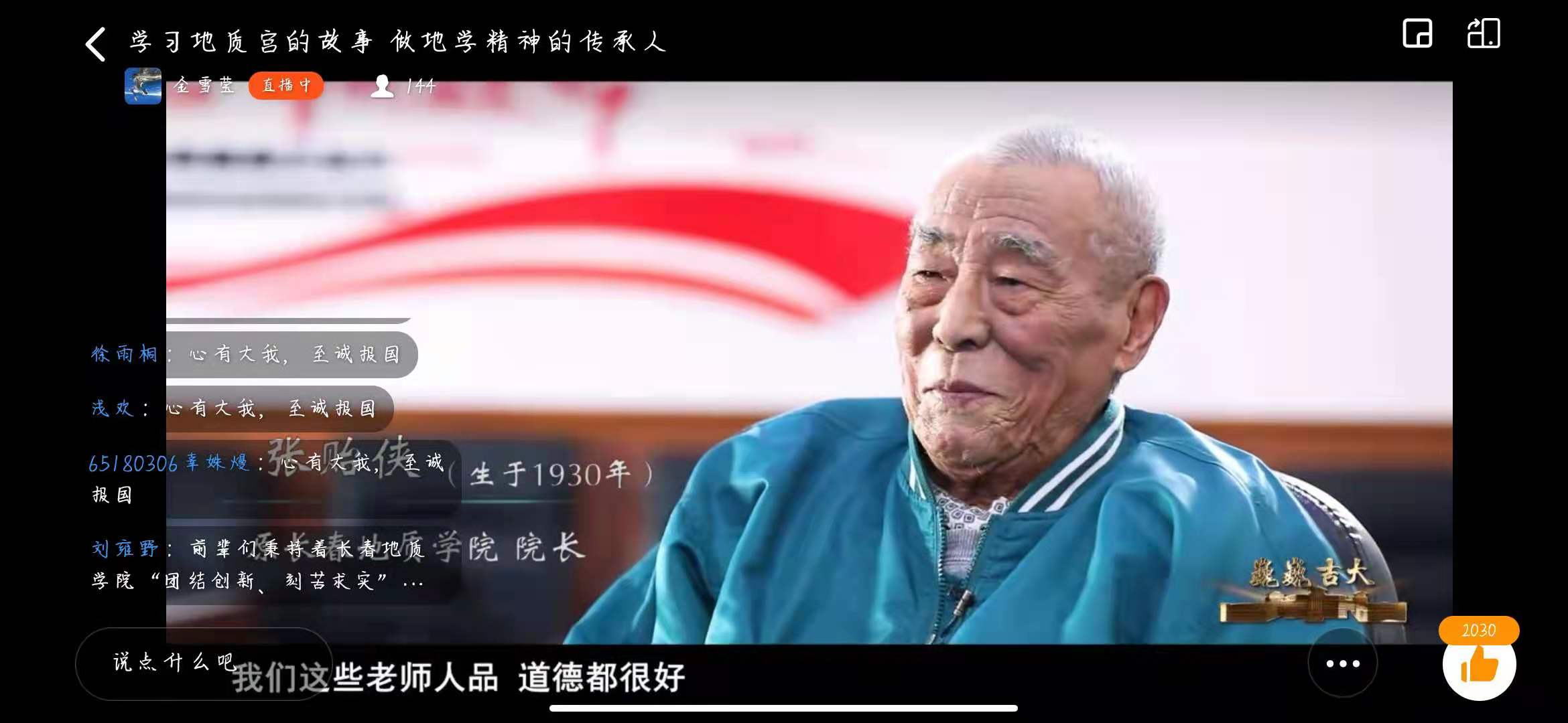 伴着纪录片铿锵有力的片头曲,同学们热情高涨,积极踊跃发言,表达对先辈们的敬佩之情。在讲述喻德渊、董申保、业治铮、俞建章这些地学宗师的事迹时,更是被深深地感动,不禁赞叹老一辈地学家不畏险阻、艰苦奋斗、勇攀科学高峰的爱国情怀。前辈们秉持着长春地质学院“团结创新、刻苦求实”的校训,将学院的优秀传统一直传承了下来,若有初心不变,何惧道阻且长,必行则将至。在纪录片结尾,同学们纷纷表达自己的决心——“向老一辈的地学家们学习”,与此同时,激起了同学们对黄大年教授的回忆,受到了一次精神的洗礼。