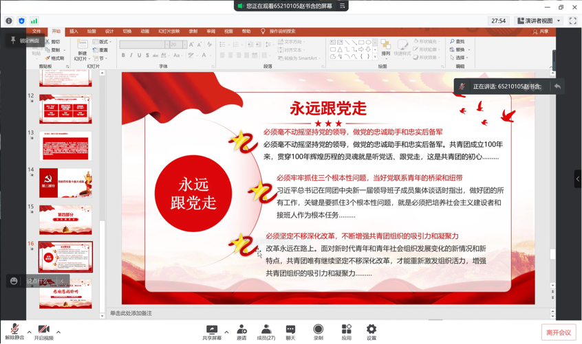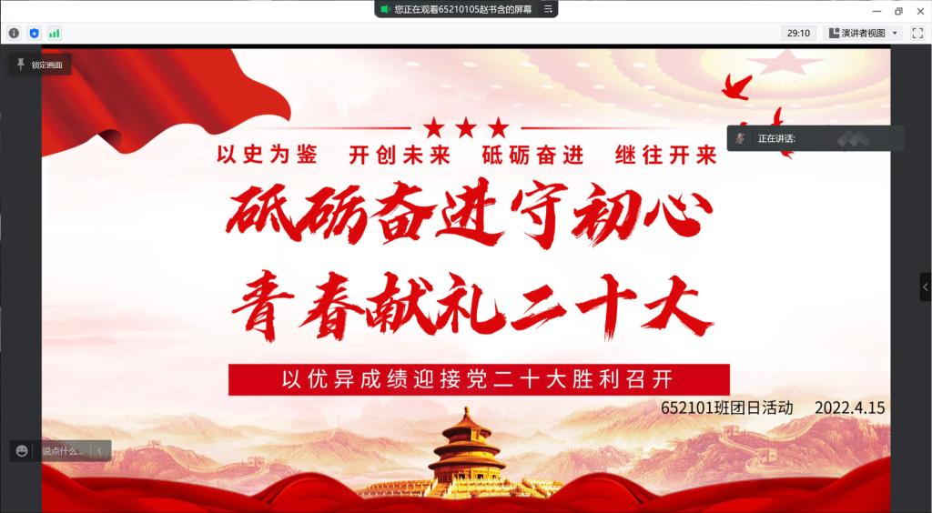 652101团支部于2022年4月15日15:00,线上开展了主题为“喜迎二十大,永远跟党走,奋进新征程“的团日活动。团日活动由团支部书记赵书含同学主持,团支部全体同学参加了此次活动。