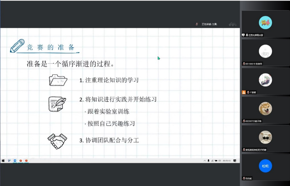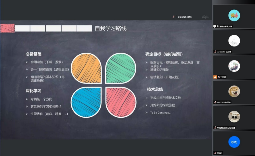 随后,嘉宾们以生动深刻的“第一视角”依次为同学们分享之前参加电赛的经验和心得体会。首先,现已直博本校的程麟涵学姐详细地介绍了省赛和国赛的时间点,并且以个人丰富的竞赛和培训经历展现了备赛奋斗的历程。然后汪勇为同学们细致地讲解了电赛模电类题目的准备工作,前科协会长黄安冉还为同学们制作了可视化的自我学习路线,涵盖了备赛的各个方面。