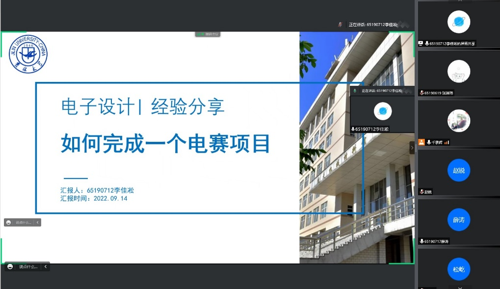现科协外宣部成员杨智伟以基础小车类电赛作品为侧重,分析其中的知识点和设计点,给21和22级同学提供了许多非常具体的学习实操建议。科协科技部长薛涛则讲解了很多与电赛有关的知识“干货”,以“旋转倒立摆”的设计为例教同学们建立起电赛设计的基础思维。李佳凇和宋诚又进一步分享了如何完成一个电赛项目,包括赛前所需的准备,电赛期间如何更合理地规划时间,赛后的优化总结等。