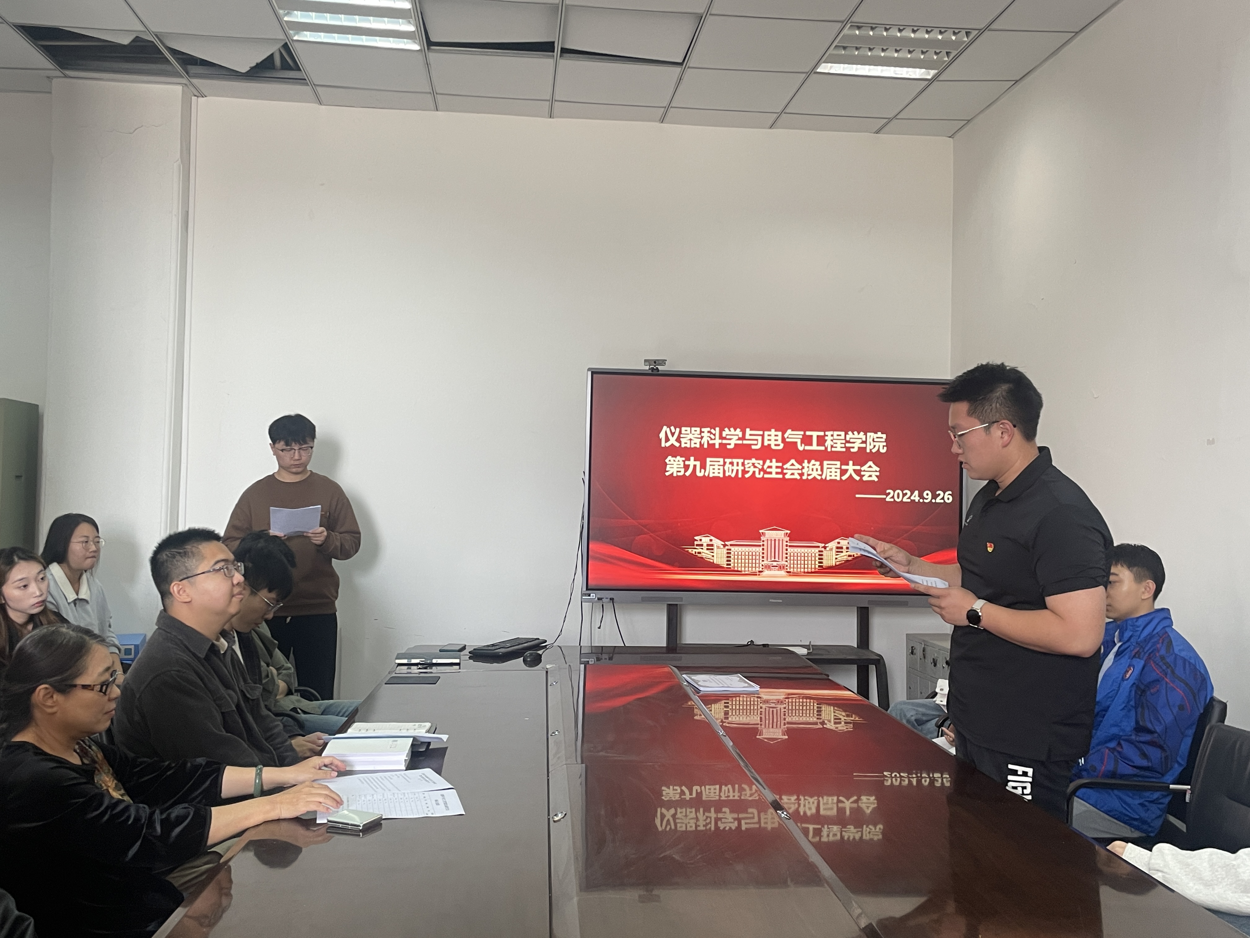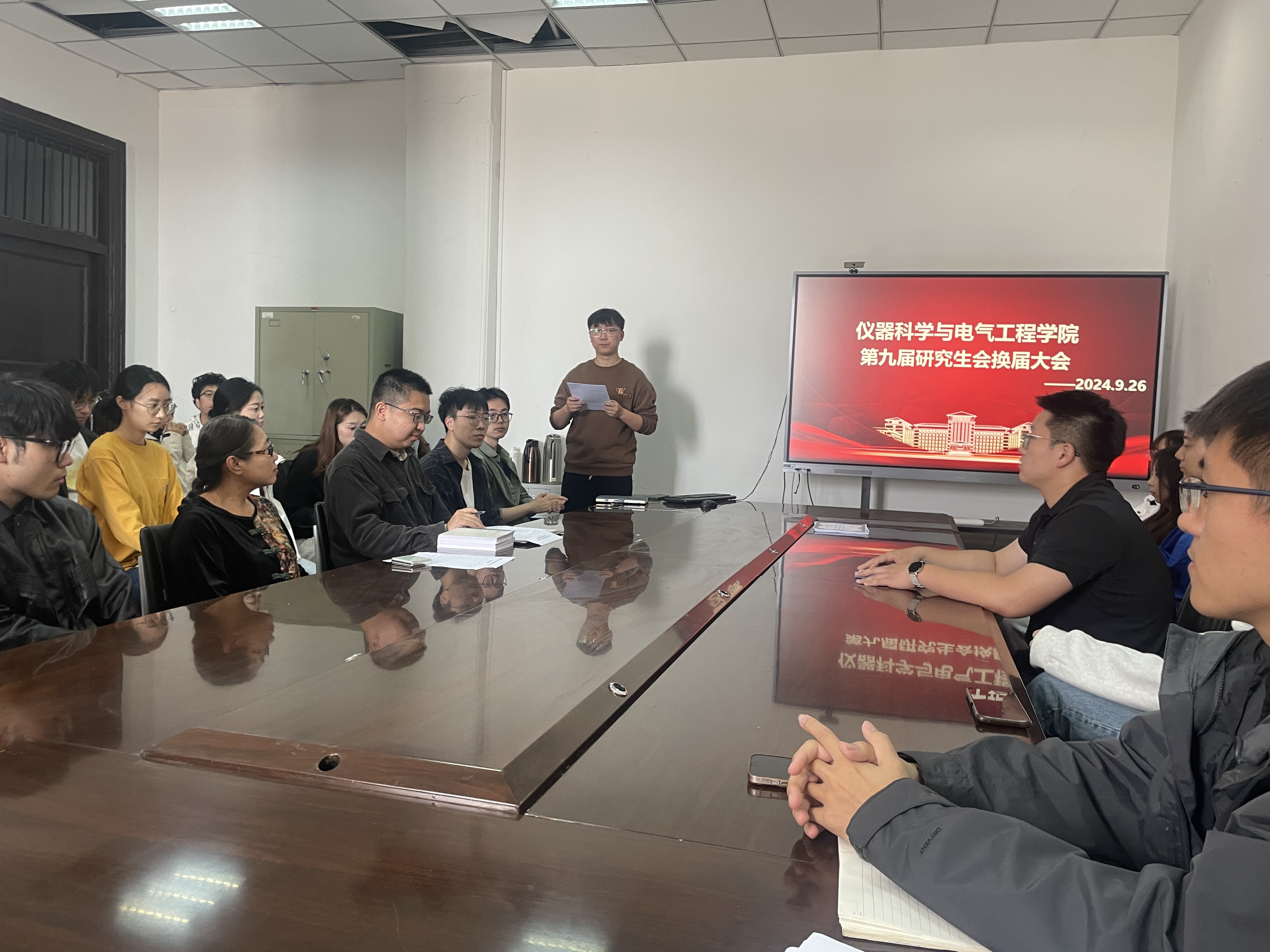 第九届研究生会换届大会在朝阳校区地质宫顺利召开。学院研究生办公室主任杨冬老师、研究生辅导员周琪老师、第八届研究生会全体负责人、第九届研究生会、负责人候选人以及各年级研究生代表等参加大会,会议由仪电学院博士学生第二党支部书记郝毅主持。