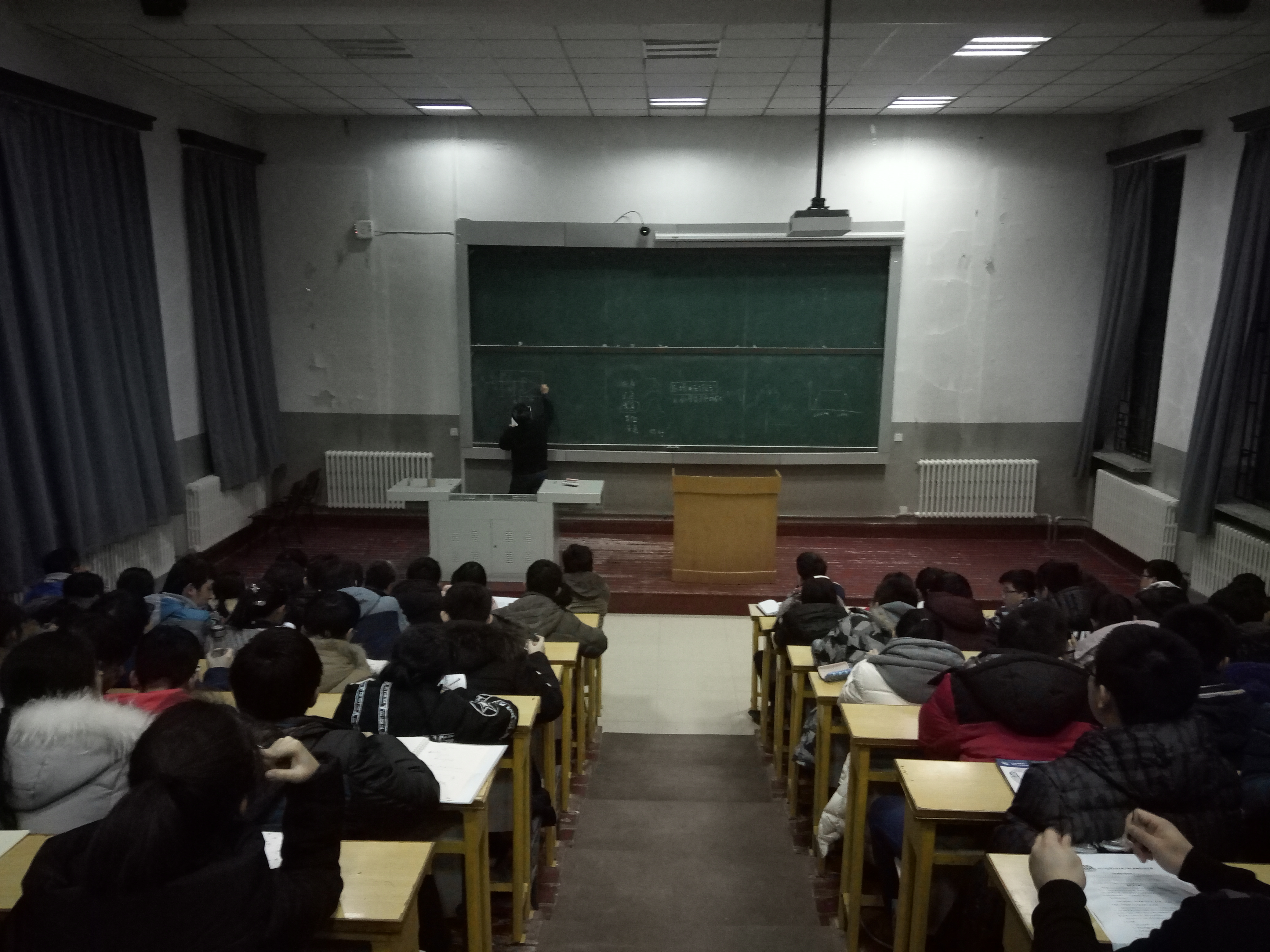 下午3:00-17:00于地质宫224教室,王应吉老师为实验室14、15、16级全体成员讲解了2013年综合测评题的设计方案。王应吉老师首先简单的介绍了滤波器的种类,滤波其种类主要有四种:低通、高通、带通、带阻滤波器。随后,王应吉老师利用带通滤波器的通式,对二阶有源带通滤波器进行了方程求解。在王应吉老师求解的过程中,全体同学都集中精神,跟着王应吉老师的思路一步一步求解下去,在王应吉老师得出方程解的那一刻,全体同学为王应吉老师献上了热烈的掌声。王应吉老师在得出方程解之后,告诉同学们用相同的方法即可求得低通、高通、带阻滤波器的解。最后,王应吉老师询问同学们在实践时遇到的问题,并给出了宝贵的意见。