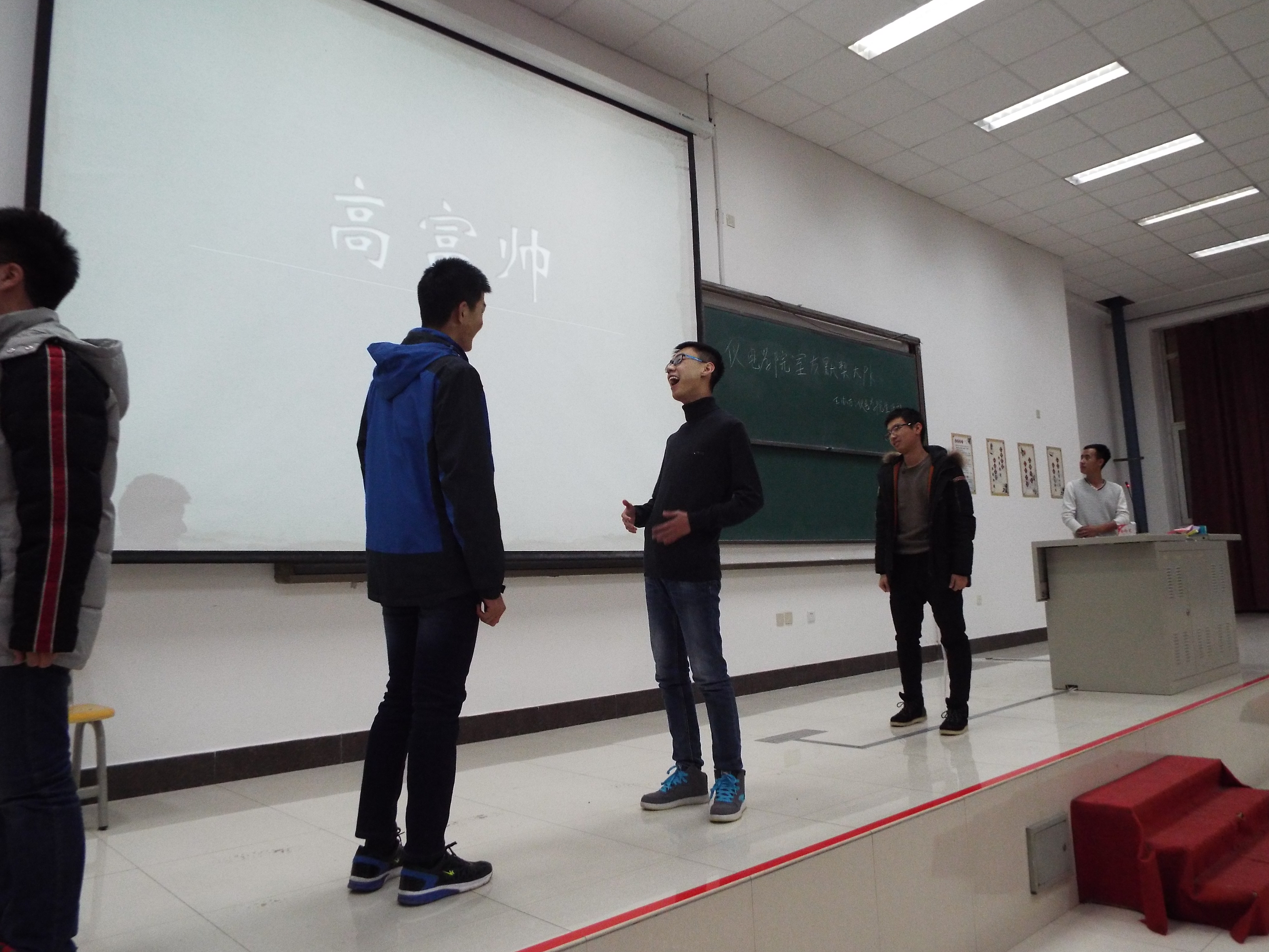 主持人齐吉政同学做了简单解说陈词后,活动正式开始,参赛选手为7组,第一环节,各组成员轮流上台抽签决定答题题目,主持人问每组几个问题,关于每个人的喜好,习惯,个人信息等每个人把自己的答案写在纸上,不许相互偷看,交头接耳,所有人的答案均一致方可得分。其中有一个幽默搞笑类的问题,四个人的答案皆为一号,现场气氛顿时高涨起来,大家笑的前仰后合,全场响起热烈的掌声,把活动氛围推向高潮。 第二环节,猜词语游戏,从得分高的一组开始,不许进行语言交流,只能用肢体传递讯息,比如其中有两个词,闻鸡起舞和苹果,参赛队员使出浑身解数为队友表演,该组虽然没有得到分数但是大家都玩得很开心,最后第一组和第二组猜出了“抓耳挠腮”各获得五分。