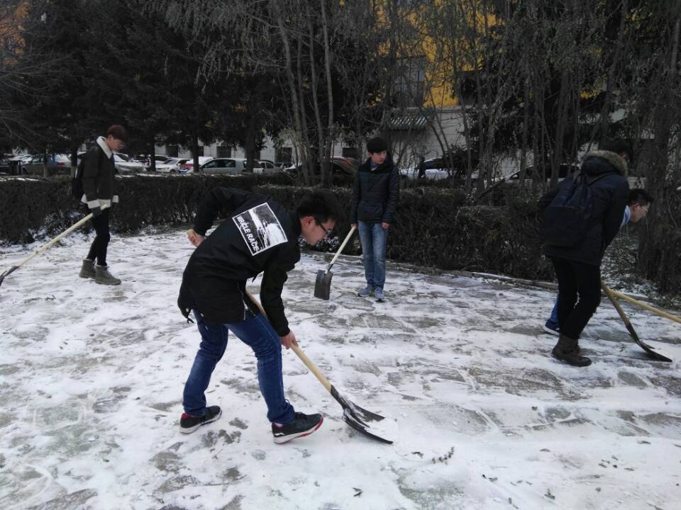 北国冬日天气寒冷,尤其是近期的积雪不能及时融化,使得一些道路变得不易通行。为尽快排除积雪给师生出行造成的阻碍和安全隐患,还全体师生一个安全、方便、清洁的校园环境。一色