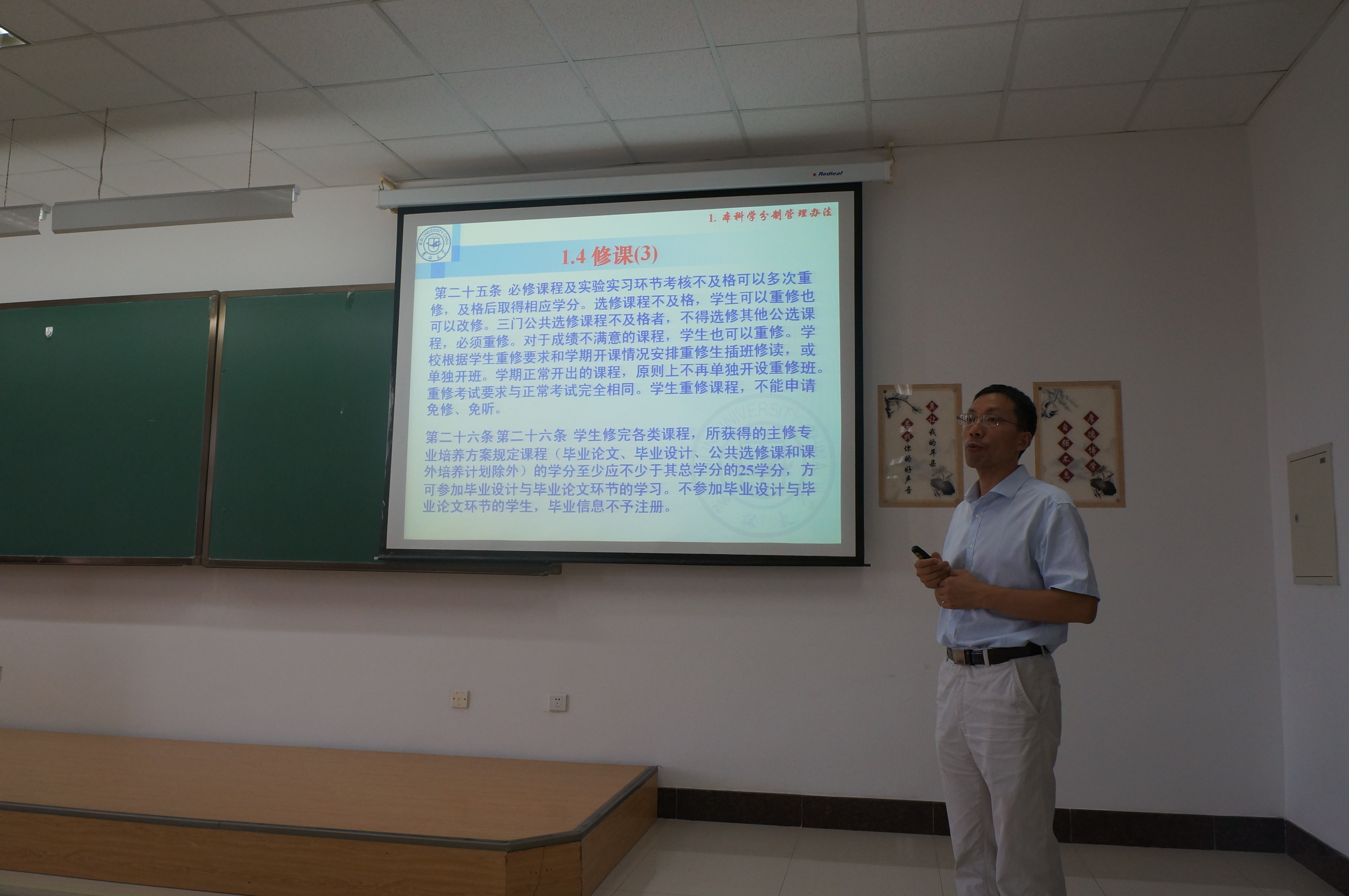 邱增凯老师首先向2016级的新同学介绍了参会的学院领导老师。然后由林君院长发言,院长向全体新生讲解了学院的总体情况,根据学院的历史发展、学科建设、师资力量、科研成果、人才培养,优秀校友,发展方向等几个方面向新生们进行了简要的介绍,同时,他还借助哈佛大学研究的结果鼓励新生要有明确的目标,他还鼓励培养新生们海纳百川,胸怀天下的激情,希望16级新生可以在未来的发展中为祖国献上自己的力量。在新生对自己的学院和所学专业有了初步了解之后,副院长陈祖斌教授为新生讲解学院的教学工作。他根据学校的规章制度,在学分制度、学籍变动、校际国际交流、保研直博政策,学业预警工作等方面向新生们做了详细的介绍,让全体新生感受到一色