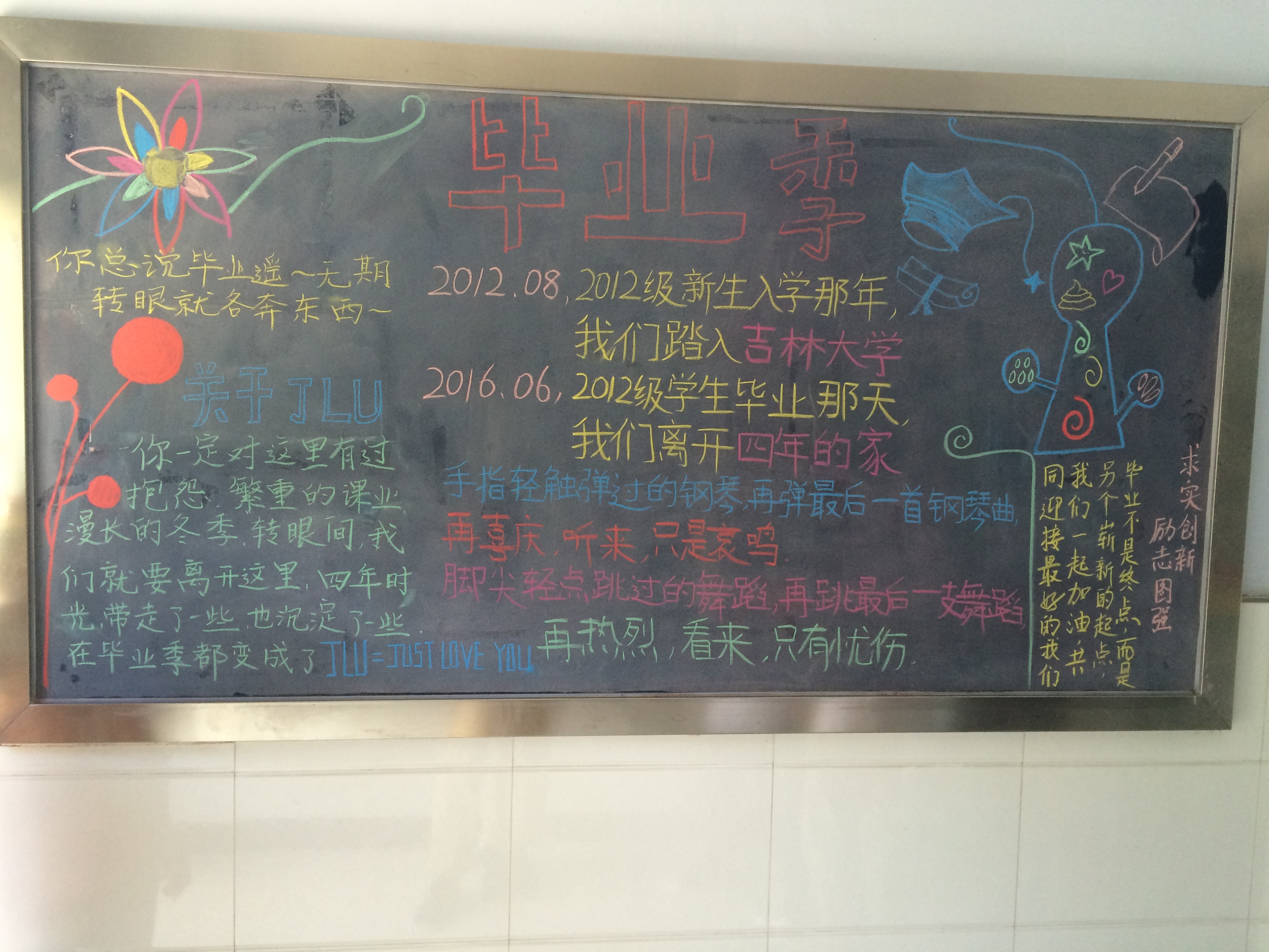 “毕业季”黑板报美化了公寓环境,加强了校园文化建设,表达了学弟学妹们对即将毕业同学们的真切祝福,也抒发了毕业同学们对校园的热爱与不舍。相信即将毕业的同学们能在未来的学习生活中再接再厉,创造出属于自己的辉煌!(一色