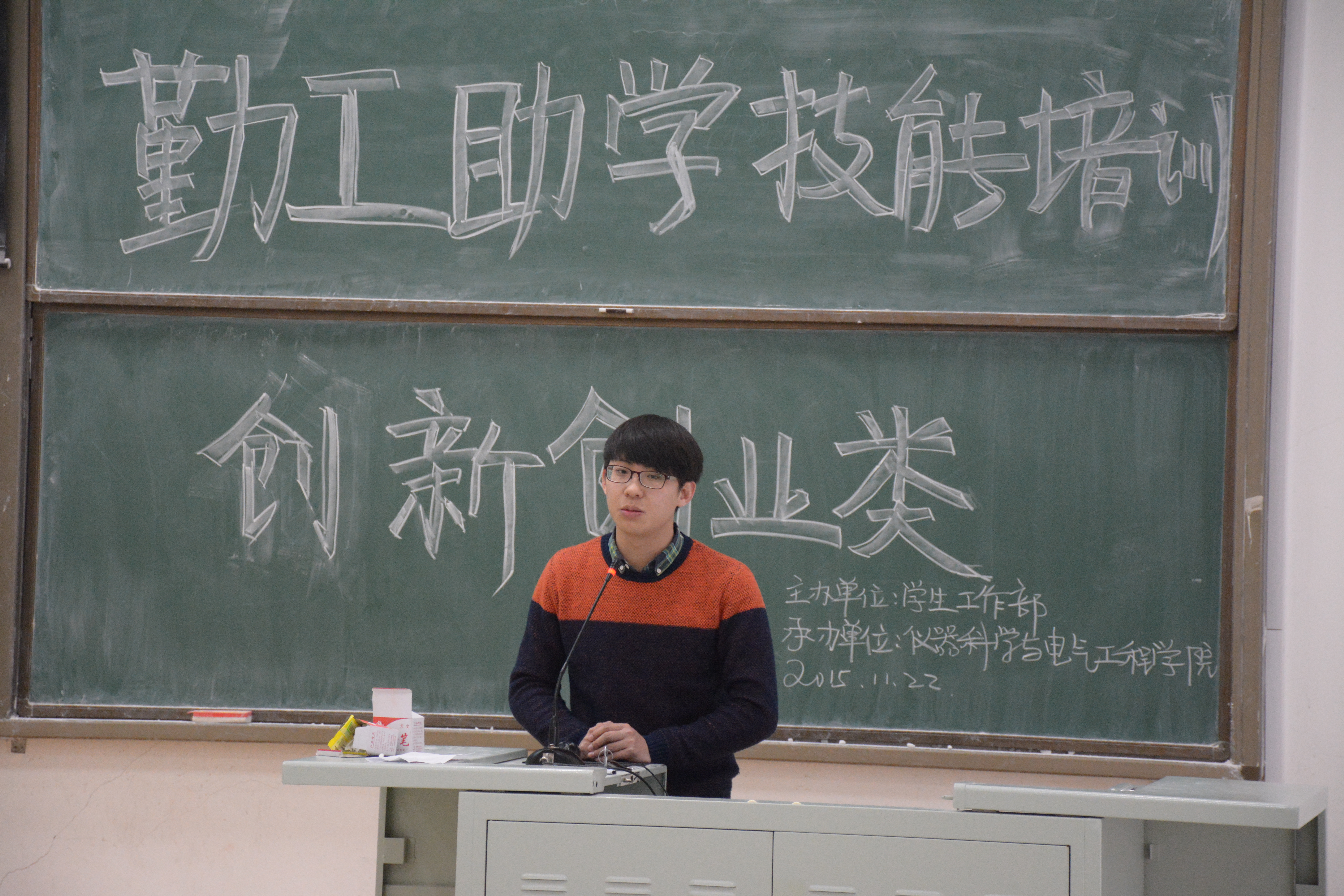 电子科技协会于2015年11月22日在中心校区李四光楼第二阶梯教室成功承办勤工助学创新创业类综合技能培训项目“双创—创新创业”专题讲座。讲座由一色