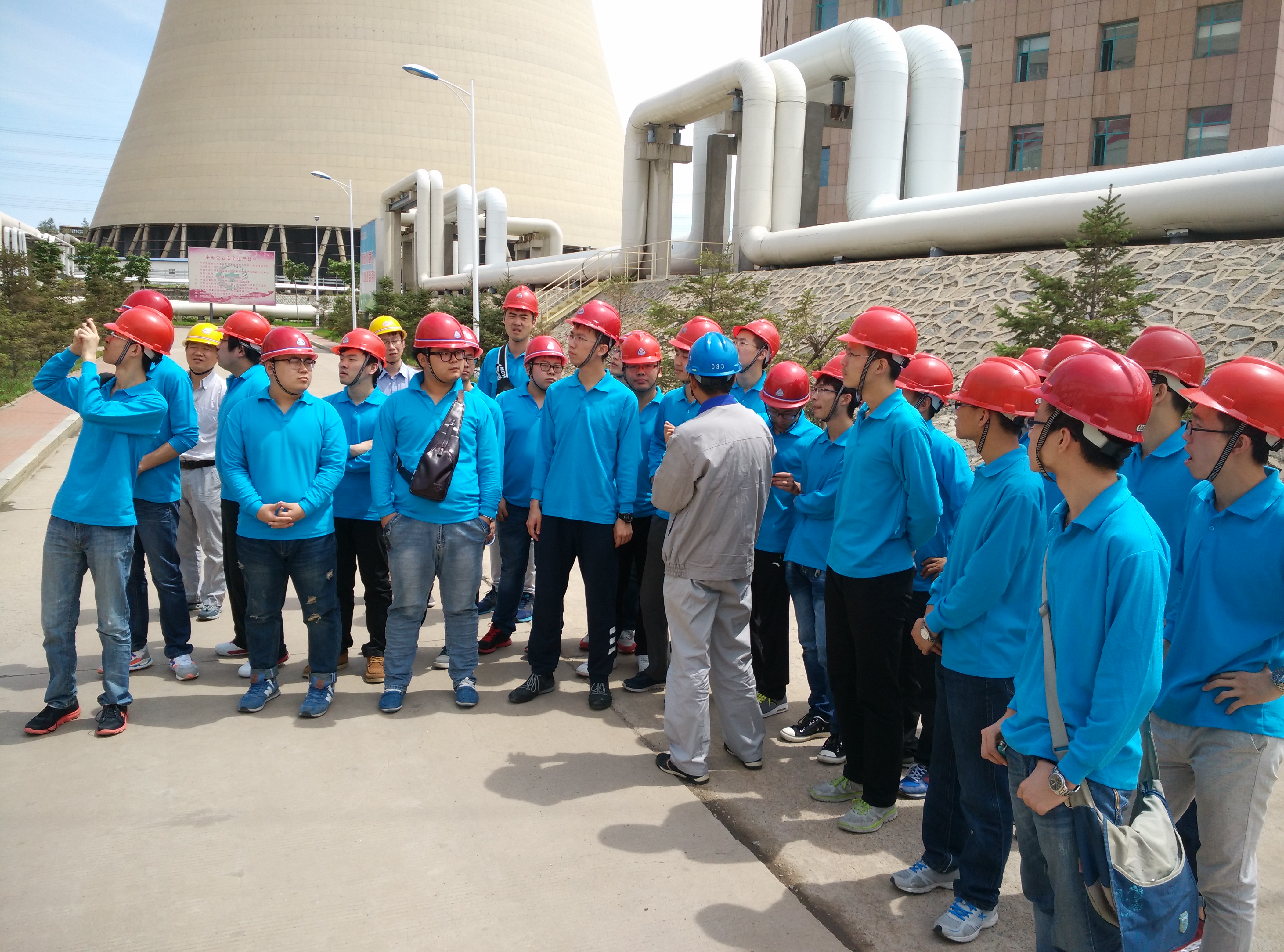 当天早上7:00,实践团全体同学在老师的带领下乘车去往大唐长春市第三热电厂。经过一个多小时的车程,实践团一行安全抵达热电三厂。实习伊始,实践团被分成三个小队,分别由热电三厂的技术骨干带领参观。技术员分别从总体概况、机械部分和电气部分等多个方面,认真细致地给同学们介绍了热电站下属的部门、工作内容以及相应的设备和技术指标。随后,同学们在解说员的带领下参观了第三热电厂的总控制室、主变压器、锅炉房、1号机组、硫化车间、仓储车间、循环水净化车间等。参观过程中,同学们更为直观地了解了热电三厂的设备以及它们的工作方式,并从电厂最初的设计、施工到建成以及后期改造各个详尽的过程得到进一步了解。