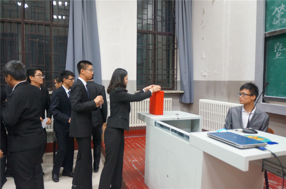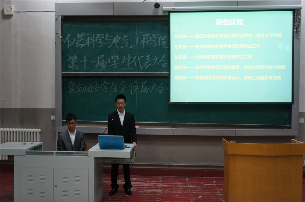 大会在轩昂壮阔的中国共产主义青年团团歌声中拉开序幕。此次大会首先审议并通过了第十届学生会主席李昊阳同学代表分团委、学生会进行的工作报告,回顾了一年来第十届分团委学生会的工作历程。对这一年来取得的成绩予以展示,同时深刻反思并陈述各方面工作的不足。随后,院团委书记兼2012级辅导员蔡印老师为第十届团学组织主要学生干部颁发了任职证书。证书颁发仪式结束后,学院第十届分团委副书记付博同学宣读了第十一届团学组织主要学生干部候选人名单,随后候选人依次上台演讲竞职。候选人们结合演示文稿陈述了自己的竞选理由和个人优势、组织和岗位认识以及任职后的工作构想,精炼而自信的演讲赢得了与会人员的阵阵掌声与赞叹。演讲完毕后各学生代表依次上台公开投票,民主选举产生新一届主要学生干部。最终,2013级于一兵同学当选第十一届分团委第一副书记,岳良广同学当选学生会主席,穆怀志、侯雪征、任晓闯当选分团委副书记,樊毅尧当选学生会副主席,大会还选举产生了分团委、学生会各部门负责人及科技协会、“牵手”青年志愿者协会、新闻通讯社等学生组织相关负责人。随后,2014级何宗泽同学宣读了倡议书,倡议团学组织的学生干部们认真工作,兢兢业业为同学们服务,为一色