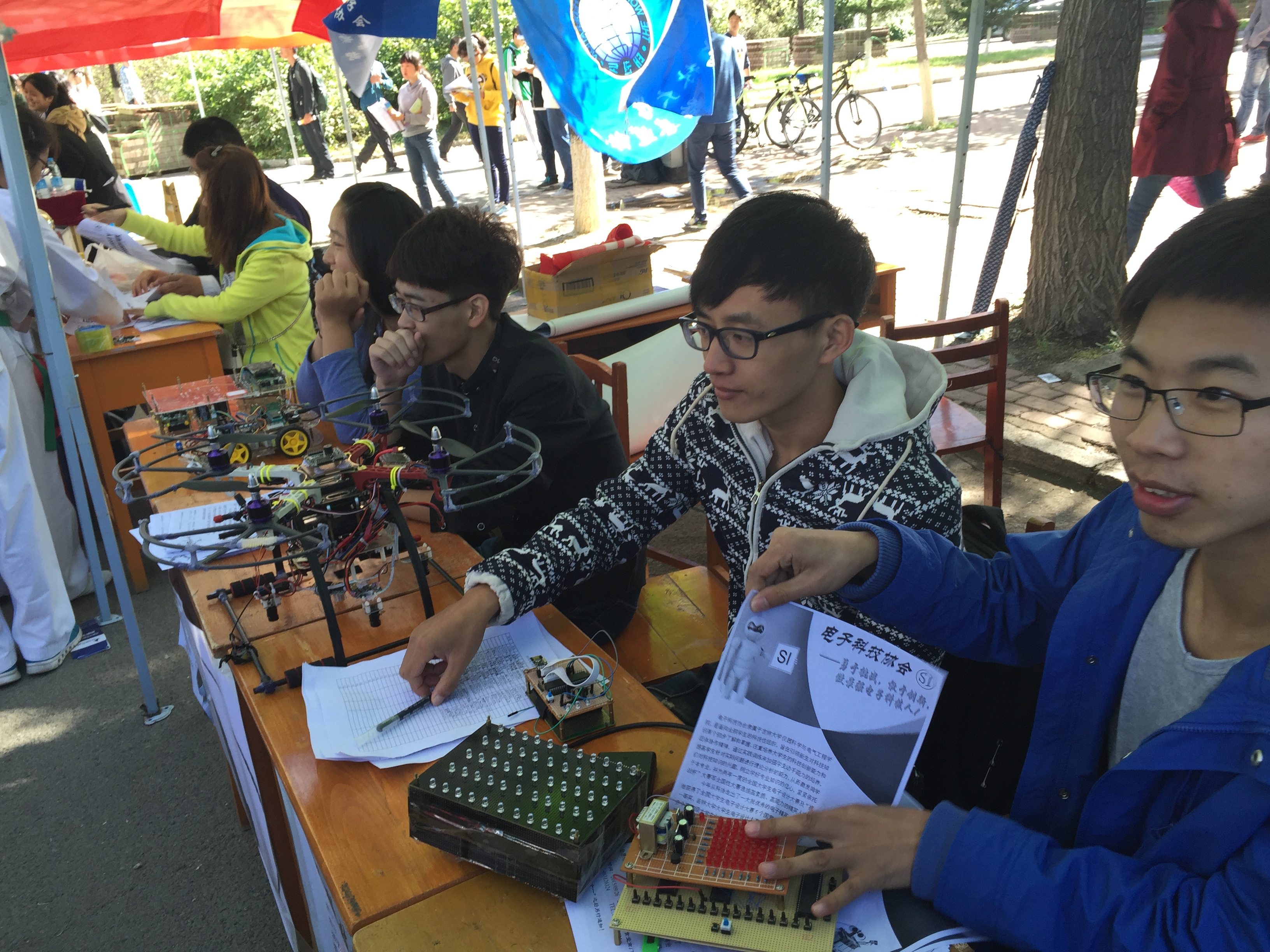 为了让喜爱电子科技的同学有一个学习交流的平台,帮助同学更直观地去了解电子科技方面的知识,2015年9月26日,电子科技协会在中心校区新食堂南门举办了新一届的社员纳新活动。科协会长穆怀志及主席团成员参加了此次纳新活动。