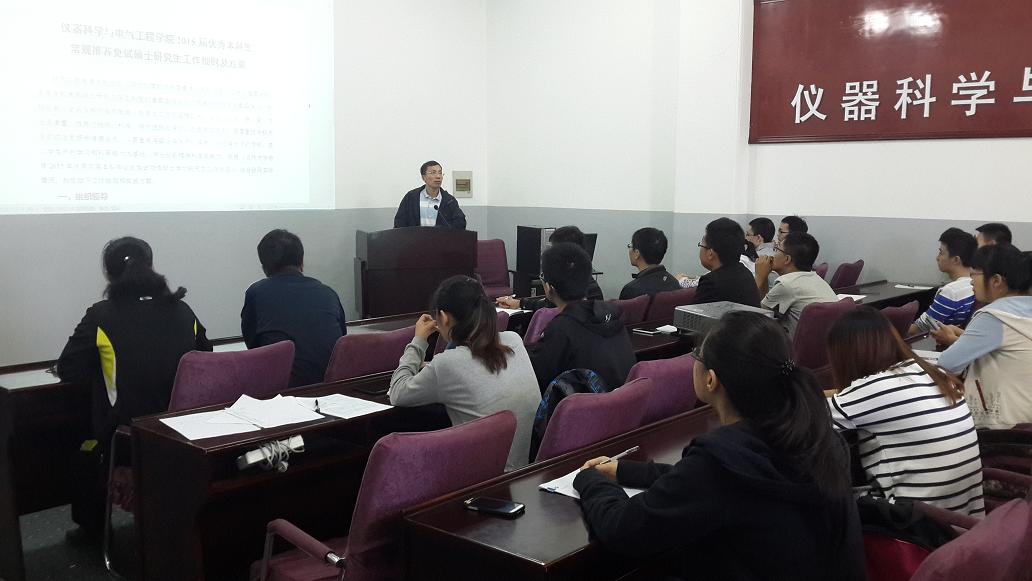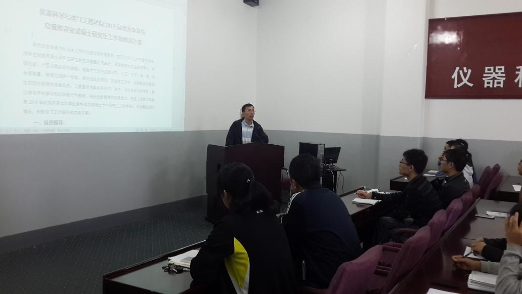 2015届优秀本科生常规推荐免试硕士研究生工作细则及方案》,就其中大家普遍关注的政策进行了详细解读,并就推免工作具体安排进行了部署。陈祖斌院长希望同学们认真研读工作细则及方案,认真按照工作安排进行申报和准备。随后,陈祖斌院长就《一色