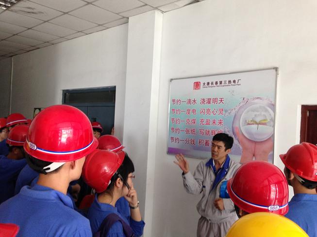 当天早上6:50,实践团全体同学在老师的带领下乘车去往大唐长春市第三热电厂。经过一个小时的车程,实践团一行安全抵达热电三厂。实习伊始,热电三厂的技术骨干分别从总体概况、机械部分和电气部分等多个方面,认真细致地给同学们介绍了热电站下属的部门、工作内容以及相应的设备和技术指标。随后,同学们在解说员的带领下参观了第三热电厂的锅炉房、2号机组等。参观过程中,同学们更为直观地了解了热电三厂的设备以及它们的工作方式,并从电厂最初的设计、施工到建成以及后期改造各个详尽的过程得到进一步了解。
