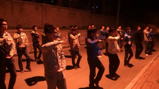 紧张有序的训练于18:30拉开序幕,每次训练主要分三部分进行。第一部分是由大三专业练习太极拳多年的学长对全体同学进行动作指导,叙述动作要领,让大家对拳法步调有一个大体的了解。第二部分则是分小组各自进行练习,分别由一位同学来对大家进行动作纠正和细节上的完善。第三部分由学长带领同学们跟随音乐完整地进行几次太极拳整套动作的练习,并在练习中不断完善动作要领。每次训练持续了一个多小时,但同学们的热情却丝毫没有退减。每一次抬手,每一次曲腿,每一次转身,每一次出拳,他们都仔细琢磨,反复练习,力求做到精准到位。他们专注的眼神和认真的态度,充分显示了其对于本次训练的重视。