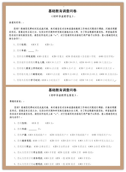 此次专题调研是在吉林省人民政府办公厅信息处组织下开展的,主要针对社会各界关于基础教育特别关切的问题,如择校问题、收费问题、补课问题、学生身体素质问题、学生综合素质问题、教师教学水平问题、中考体制问题等开展专题调研,旨在通过调查研究制定下一步促进全省基础教育均衡发展、科学发展的措施和办法。本次调研工作由吉林省政府办公厅信息处牵头组织,省教育厅、省监察厅、省审计厅、省物价局、省政府发展研究中心、长春市政府办公厅等职能部门配合开展,主要围绕初中毕业班展开。一色