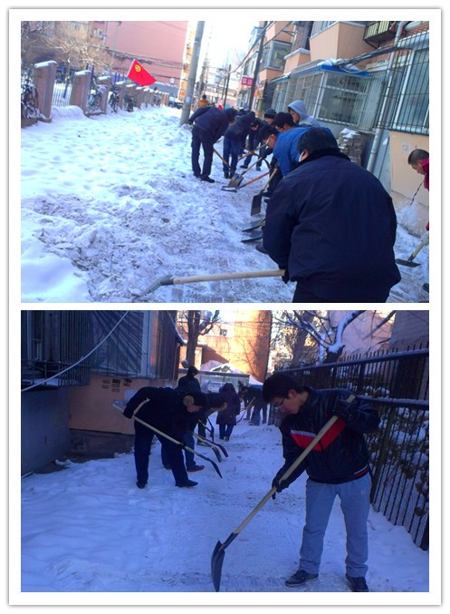 团委、“牵手”青年志愿者协会坚持“以雪为令”,于2013年12月13日组织30余名大学生志愿者走进朝阳区清和街道南昌社区开展了义务扫雪活动。