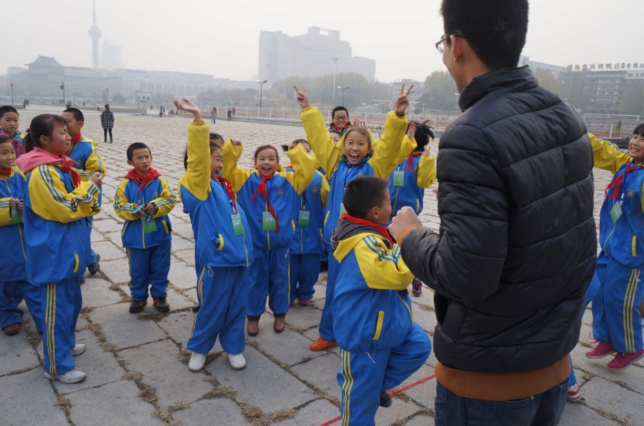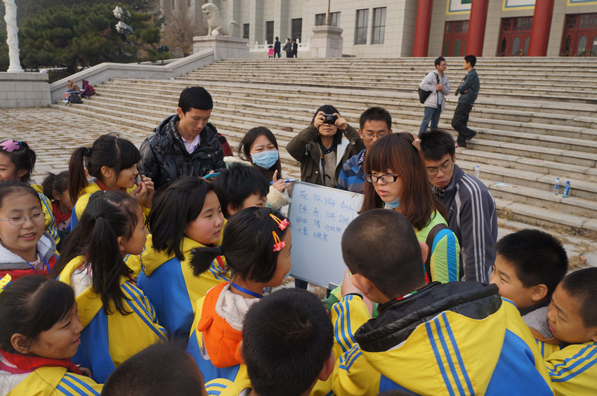 大学生志愿者们带领来自长春市西安小学的64名农民工子女在文化广场地质宫门前开展了沟通传递爱心,周末圆梦大学”素质拓展活动。