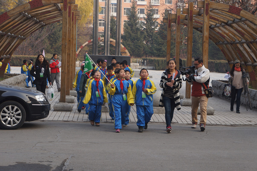 早上8:00,来自西安大路小学四、五年级的64名学生乘坐大巴车来到了一色