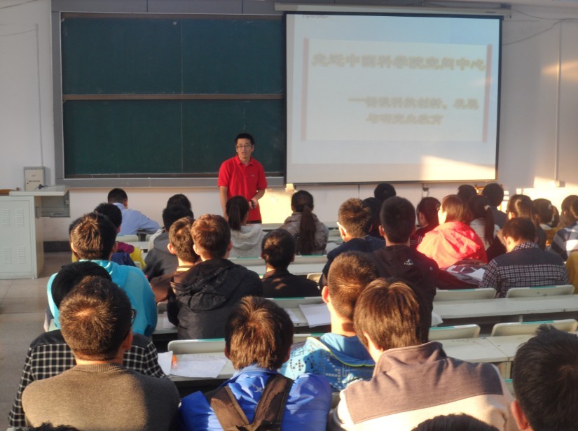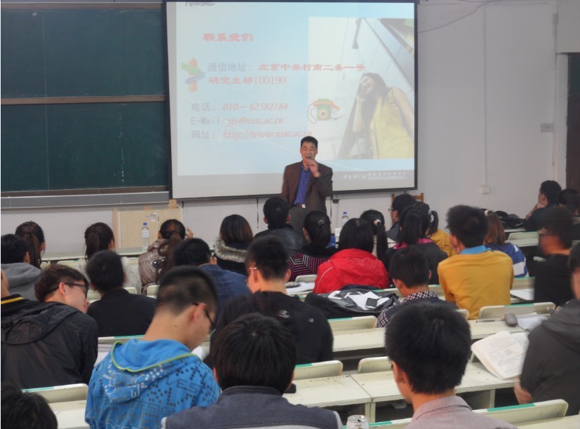 在朝阳校区水工楼519阶梯教室举办了以“畅谈科技创新、发展与研究生教育” 为主题的保研考研专题宣讲会,此次宣讲会荣幸地邀请到了中国科学院国家空间科学中心研究生部主任潘奎英老师和研究生部张作和老师为大家介绍中国科学院的研究生招生及培养的相关情况。宣讲会由院团委书记、2011级辅导员朱宇主持,学院2011级全体同学参加了此次宣讲会。