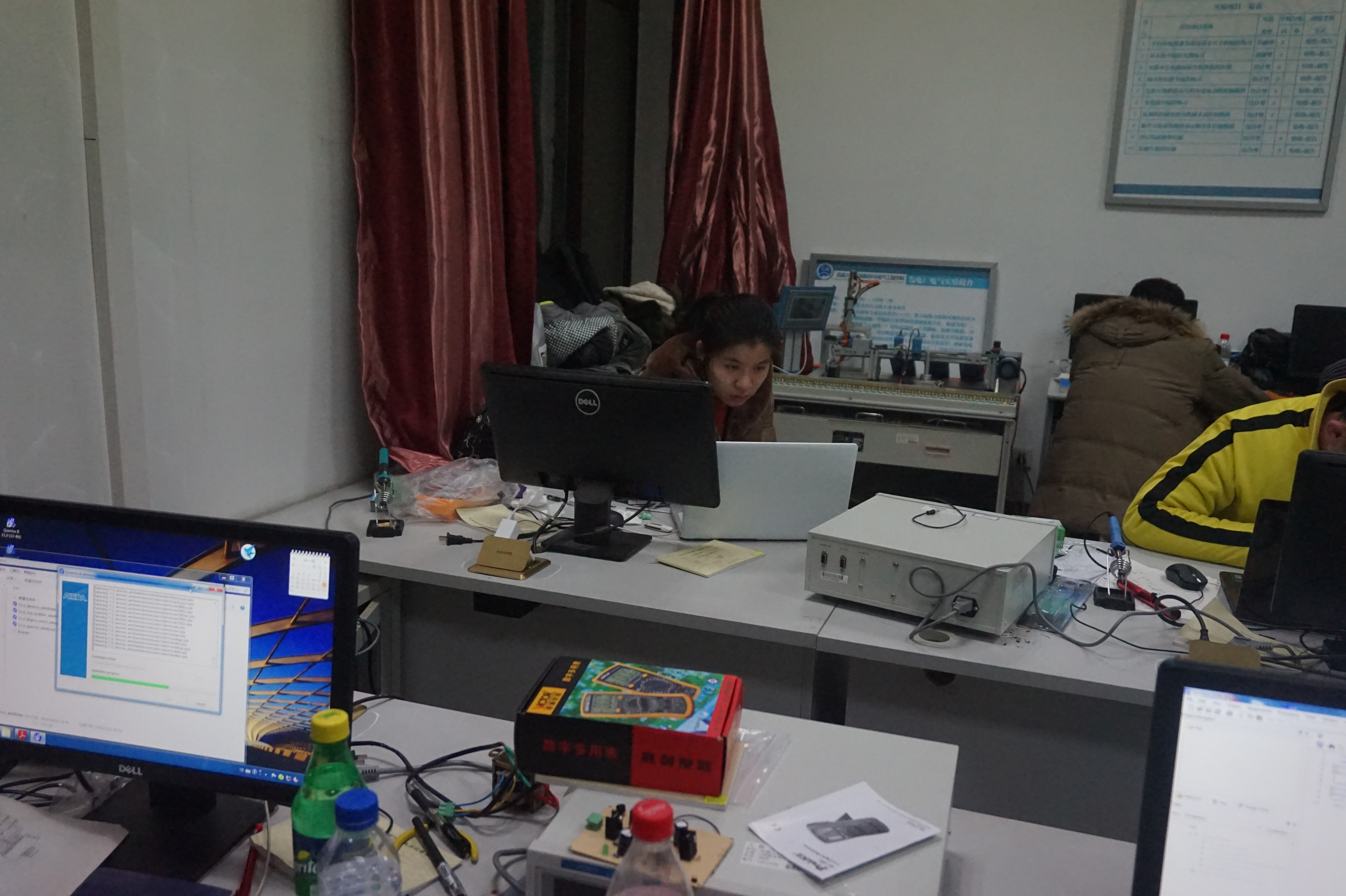 上午8:00-11:00于地质宫224教室,易晓峰老师为2013级模电电源组,2014级队员讲解了20dB衰减器的设计与制作。易晓峰老师首先简单的介绍了衰减器的种类,空间电磁耦合线圈以及需要注意的问题。随后,易晓峰老师主要讲解了BT型衰减网络步级衰减器以及L型衰减器的相关知识。下午13:30-16:00于地质宫408实验室,孙峰老师为2015级队员讲解金属屏蔽盒盒射频线的使用。孙锋老师的课堂内容主要有两点:一、金属屏蔽盒。二、PCB板相关知识。首先,孙老师向同学们介绍了金属屏蔽盒作用以及相关的用途。同时,老师向同学们介绍了电磁兼容设计应达到的目的和屏蔽技术按屏蔽电磁场性质、屏蔽体结构的分类。接着,老师讲解了PCB板相关的知识以及EMC产生的原因和解决方案。最后,孙锋老师用示波器生动地向同学们展示了信号的屏蔽。下午13:30-晚上21:00,2013级队员分别进行各组的专业社会实践——倒立摆和频率计。
