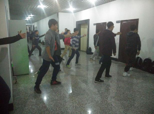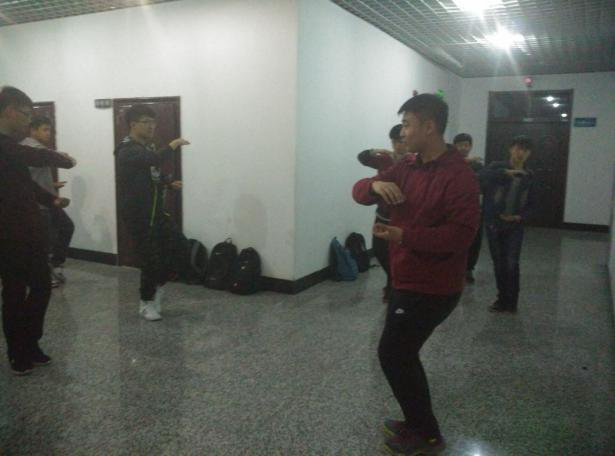 太极拳的排练也在紧锣密鼓地进行。为了能在太极拳的比赛中取得出色的表现,2015级同学们在体育部学生干部的带领下于2016年4月6日21:10准时在实验楼集合进行培训。