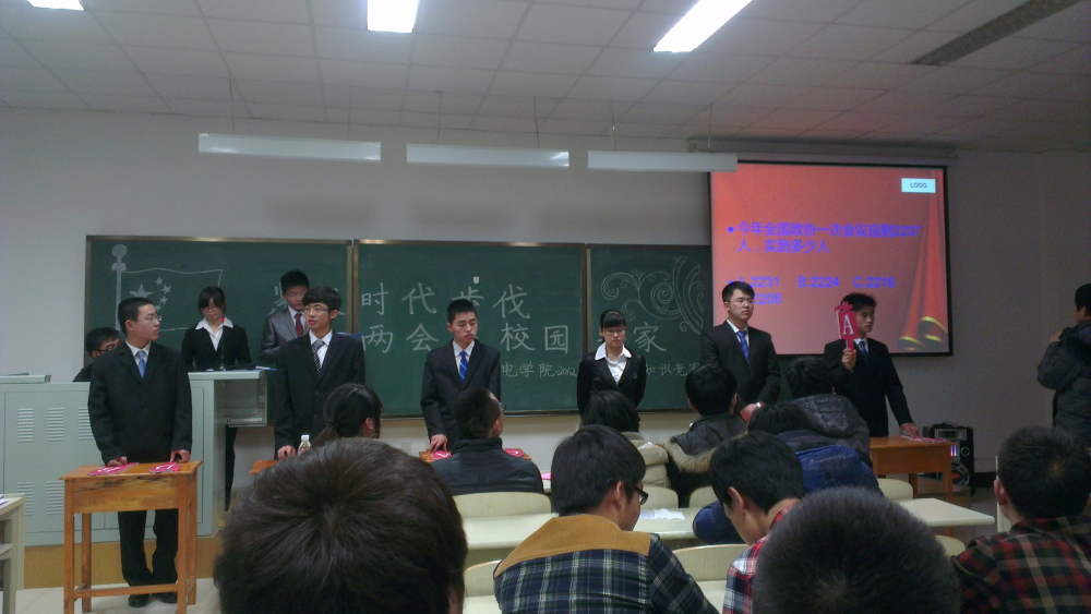 于2013年3月21日18:30时在中心校区李四光楼208室隆重举办了主题为“紧跟时代步伐,让两会在校园安家”的两会知识竞赛活动。此次两会知识竞赛由仪电学院分团委学生会主办,学生会生活部承办,并受到了吉大电视台的关注报道。第八届分团委副书记李娇阳、学生会主席朴冠宇、院学生会常务副主席任广安、学生会副主席王洪超以及学生会学生干部出席了活动,2012级全体同学参加了活动。