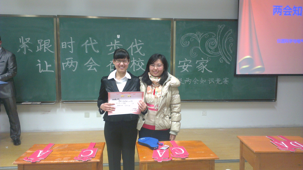 本次竞赛由两会宣传短片放映、必答题、抢答题、风险题﹑两会知识幻灯片展示﹑颁奖六个环节组成。整场比赛秩序井然、精彩纷呈,赛场内气氛庄重而热烈。同学们饶有兴趣地观看了纪录片,感慨于近几年中国的发展历程。纪录片放映结束后便立即进入必答题环节,已做好充分准备的各位选手满怀信心,沉着冷静,积极应答,大家的表现都非常优异。接下来是抢答题环节,考验知识素养的同时也要求选手有快速的反应能力。经过一番角逐,选手们尽展己能,不仅为班争光而且带领我们重温了祖国近年来艰难而光辉的历程。紧接着的风险题环节,新颖的比赛形式让现场气氛瞬时活跃起来,选手与搭档的默契配合,充分展现了同学间的凝聚力及创先争优的积极精神。比赛结束,经统计分数确定最终获奖情况,获得一等奖的班级为四班。分团委副书记李娇阳、学生会主席朴冠宇、生活部部长陈长松分别为选手颁奖并合影留念。在热烈的掌声中,本次两会知识竞赛圆满落下帷幕。