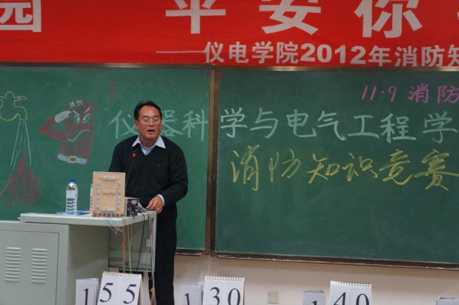 伴随着震撼的消防宣传视频短片,活动正式开始。首先进行班级风采展示,由每位参赛选手分别上台做自我介绍。各位选手英姿飒爽,展现自信风采,并与各自班级共同喊出了响亮的口号,尽显仪电学子的澎湃激情。接下来由主持人宣读比赛规则,比赛分为必答题、抢答题、风险题和附加题四个环节,采用记分排名制。在比赛中,各队选手积极踊跃,发挥出色,尤其在抢答环节,选手们针锋相对,互不示弱。互动环节更是热烈纷呈,同学们纷纷抢答互动问题,回答正确的同学每人获得了一份精美礼物。比赛期间,由每班派出代表上台进行了才艺展示,为选手们加油助威,充分展现了各班同学的才艺和风采,把全场的气氛推向了高潮。经过紧张激烈的角逐较量,最终2012级六班代表队脱颖而出,获得第一名。伴随着热烈掌声,齐占斌老师、房华老师、李允权老师依次为获奖同学颁奖。活动的最后,李允权主任做了总结讲话。他首先代表校保卫处向在本次竞赛中获奖的选手们表示热烈的祝贺,并向积极筹备和组织此次竞赛的仪电学院相关领导老师、工作人员和观众同学们表示诚挚的感谢。他希望学院全体师生进一步加强消防宣传教育工作,增强全民火灾防控和应急处置能力;希望每一位同学都能做到积极主动地学习消防知识,掌握基本的消防技能;希望学院加强领导,广泛动员,加强宣传发动,创新工作载体,制定针对性的活动方案,扎实有效地开展好各项活动,把消防安全宣传各项工作落到实处,推动防灾减灾工作的深入开展。