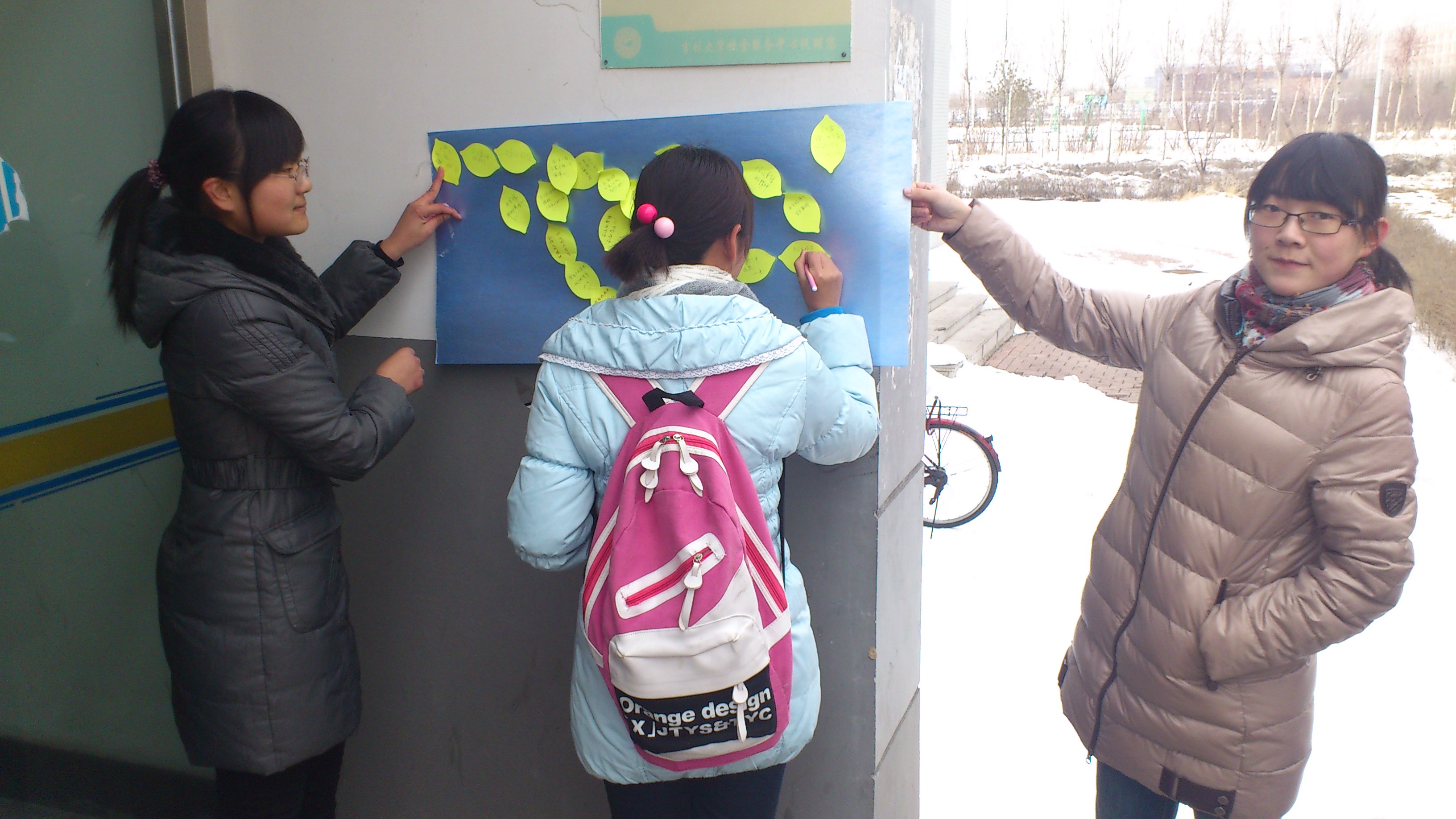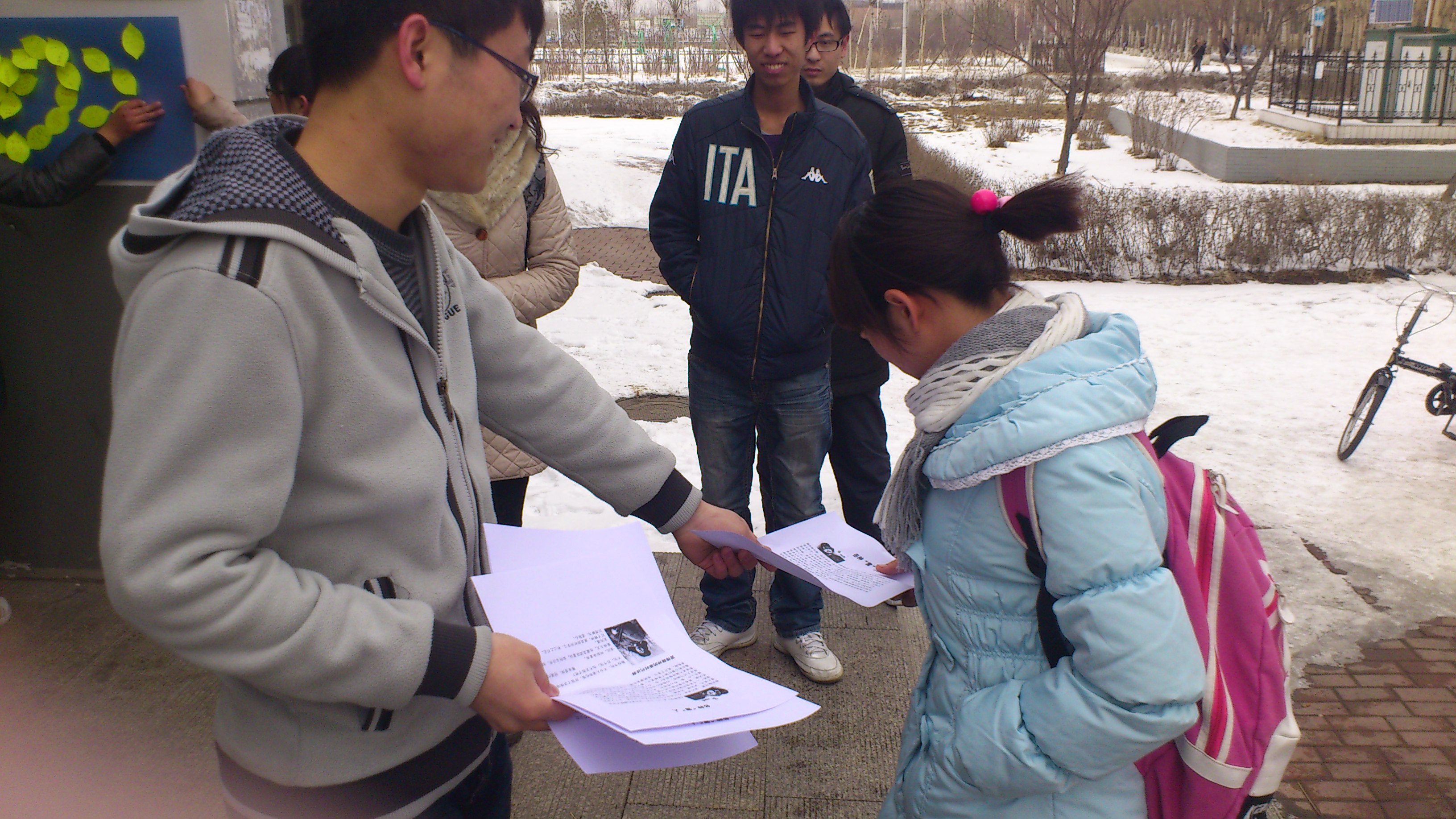 3月10日上午,2011级2班同学们奔走于各个寝室之间,宣传学雷锋活动,并请他们写下自己的口号。中午,各位同学在新食堂门口集合,向来往的同学分发“向雷锋同志学习”的宣传单,邀其填写自己的寄语,并赠予一朵我们亲手制作的纸玫瑰。之后,同学们马不停蹄地前往中心校区图书馆,进行义务整理图书的活动。在图书馆里,同学们义务帮助工作人员分类整理书籍,受到师生一致好评。伴着窗外飘零的雪花,本次“学习雷锋精神”主题团日活动圆满结束。