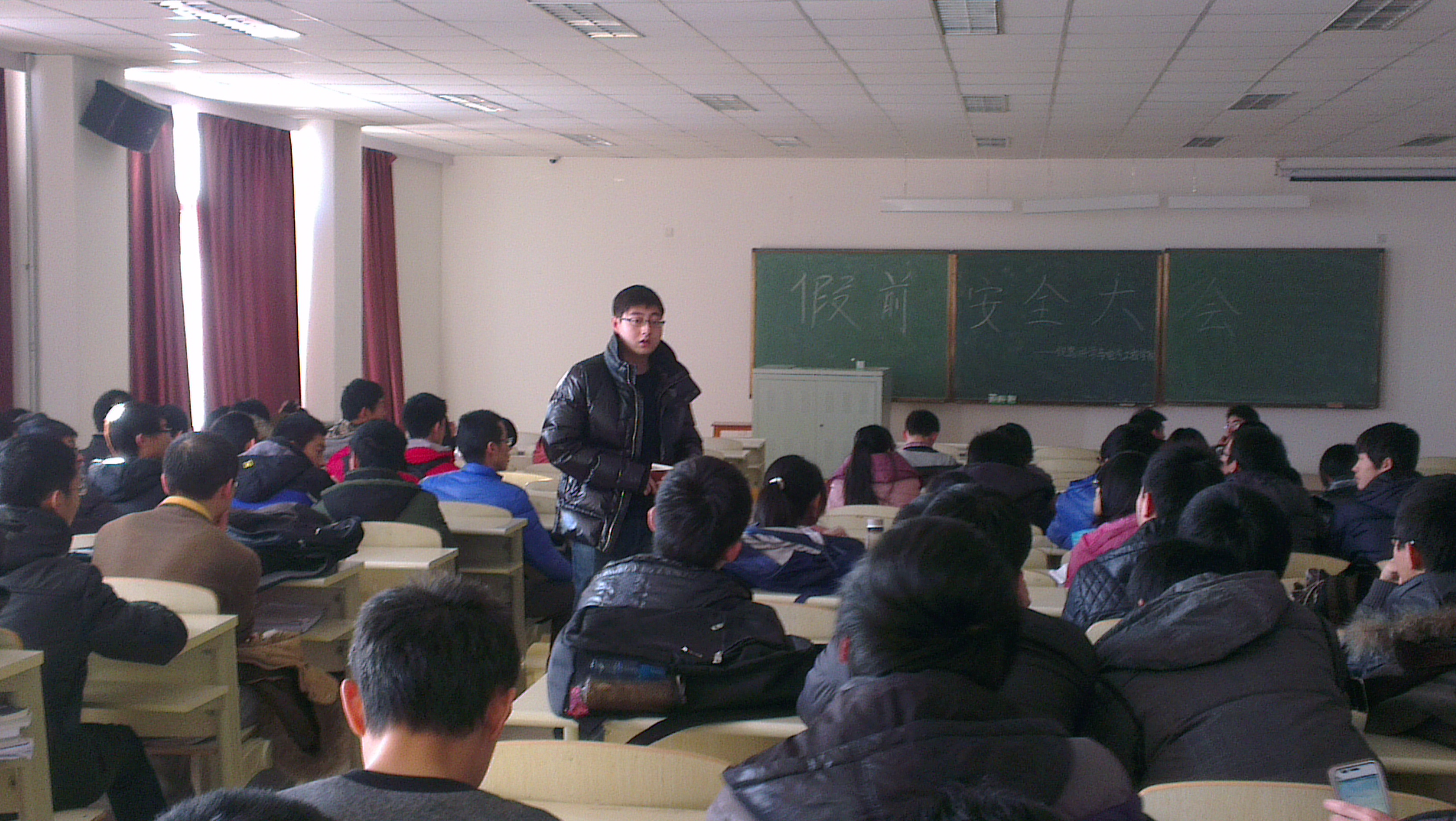 2012年12月31日12:00时,一色 于李四光楼302室召开了期末考前动员寒假假前安全教育大会。2012级辅导员蔡印老师出席本次大会,仪电学院2012级全体同学参加了本次大会。
