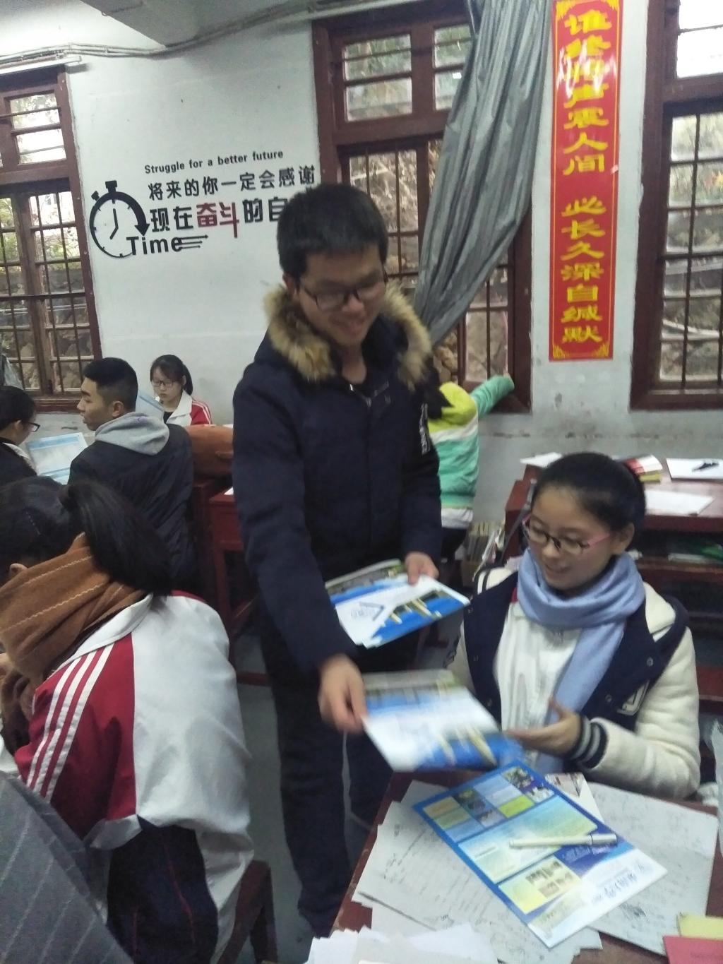 的宣传PPT、简介小册子、宣传片和重点学院的宣传页,以备宣传之用。宣讲活动对象主要为高三年级同学,陈丽琪同学负责录像、徐明辉同学负责拍照,其他同学负责分发印有一色