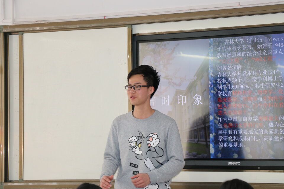 招生宣讲活动。吉大学子兵分两路,一路由王喜钦等人到指定的教室以PPT以及视频的形式深入介绍吉大专业设置、师资力量和优势科目等话题。另一路则由陈俏骏带领吉大学子到特定的广场处进行宣讲,通过赠送吉大明信片、书签、现场播放吉大宣传片等许多方式进行。他们热情的讲解吸引了许多学弟学妹的驻足观看,吉大的展位围满了渴望了解大学生活、更渴望了解吉大生活的高三学子们。同时,他们还鼓励高三学子自信备战高考,鼓励高一高二的同学努力学习,以吉大为学习目标,还分享了高中学习以及备战高考的经验与方法,并祝愿高三学子们在2018年高考中都能考出优秀的成绩,建议高三学子在高考后积极报考一色