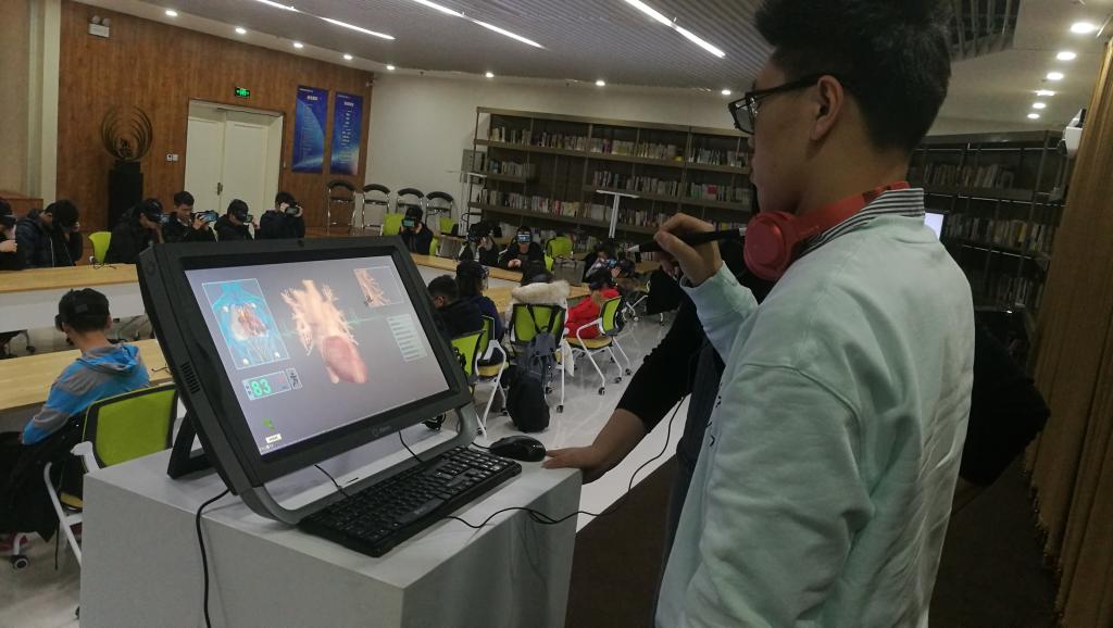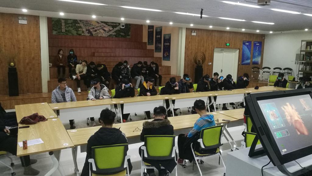 参观活动开始,领队老师将同学们分为4组,前去不同的参观地点。首先是体验VR技术,感受科技对日常教学的辅助功能。现场老师向同学们讲解了VR技术的发展历史以及发展前景,接着让同学们体验了VR技术,同时邀请感兴趣的同学上前体验VR技术在医疗教学上的应用。同学们对此表现十分踊跃。其次是参观一色