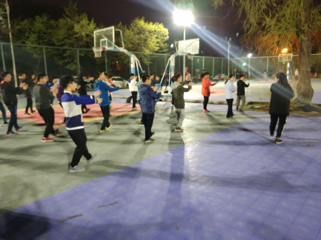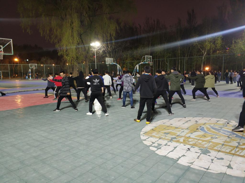 5月9日晚上9:00,仪电学院太极训练如期在行政楼篮球场展开,每一位太极方队的队员在教练宋雨鑫的指导与带领下连贯的学完了所有动作,并有条不紊地重复练习每一招一式以加深印象。在流畅、舒缓的音乐中,队员们的动作舒展,但节奏与队伍整齐度把握也待改善。每一位队员都全神贯注的训练,在教练的指导下调整自己每个动作,虽然现在的动作并不是十分完美,但大家的一招一式中都展现出了太极的柔和之美。