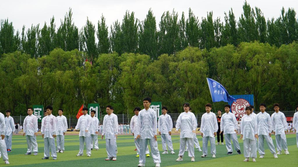 经过为期两周的培训,同学们已经能够完整熟练地完成整套太极拳,准备迎接比赛的到来。上午8:00,队员们在体育场内集合,回忆比赛流程和动作要领,做好赛前准备。仪电学院太极方队由32名队员和一名旗手组成,随着入场口令的下达,方队踏着整齐的步伐,喊着响亮的口号进入场地中央。在舒缓的音乐中,同学们动作舒展大气,节奏稳健,队伍整齐划一,充分展现了太极的柔和之美。