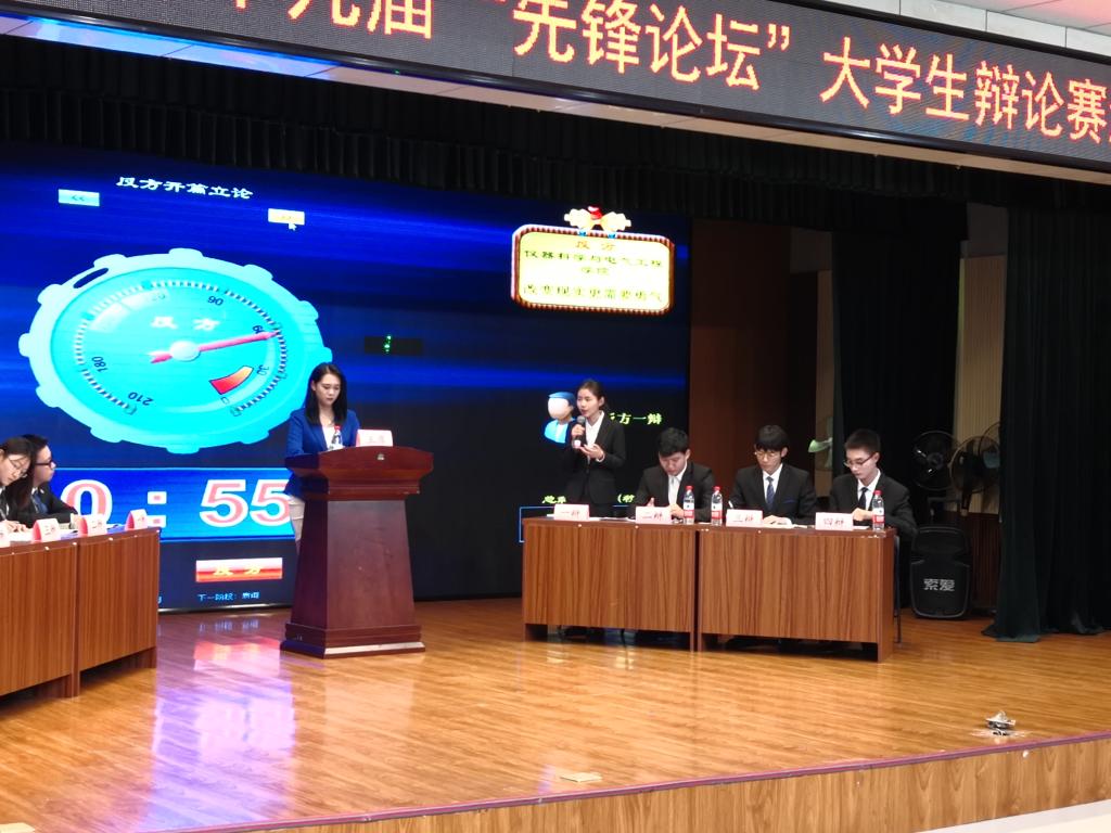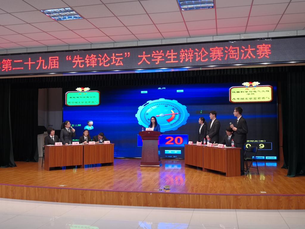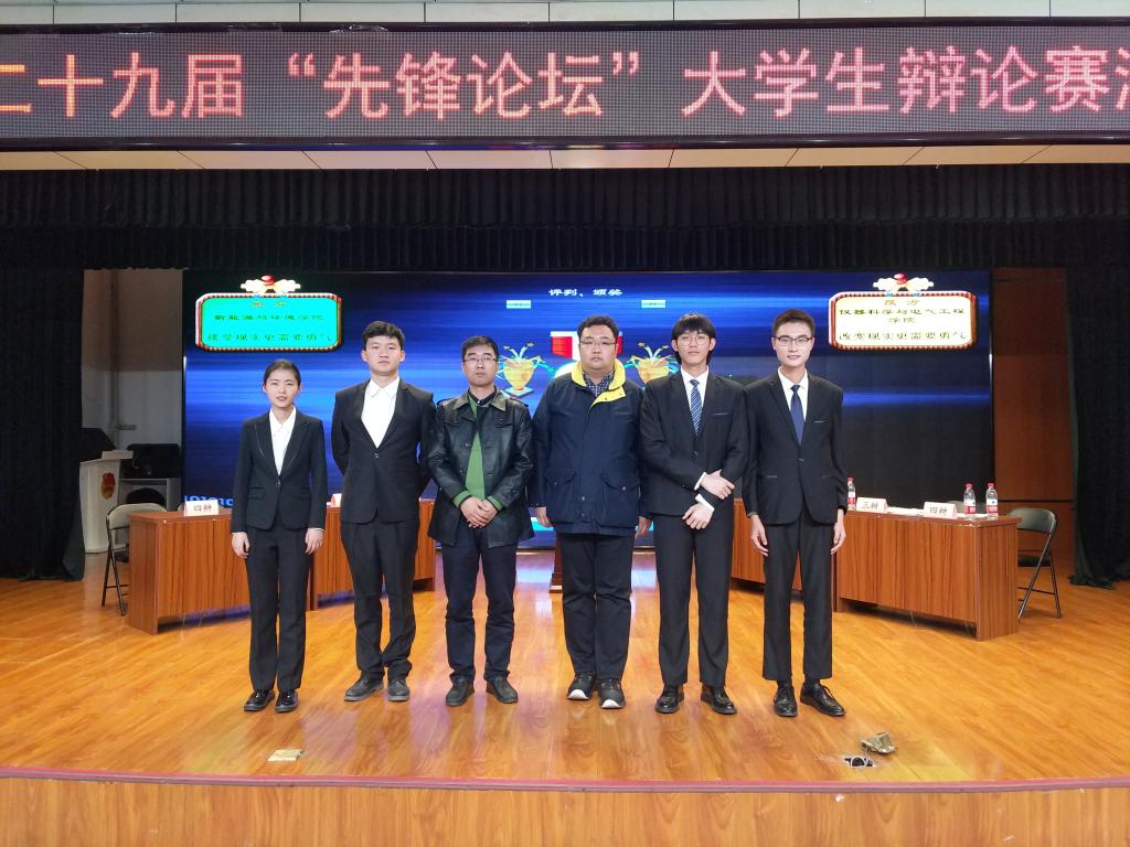 辩论队参加了第二十九届“先锋论坛”大学生辩论赛,于10月20日下午3:20在中心校区田家炳大学生活动中心小礼堂举办的淘汰赛中首战告捷,战胜了新能源与环境学院辩论队。2018级王舒啸、严辰龙、刘苏辉同学,2019级刘航同学参加比赛,一色