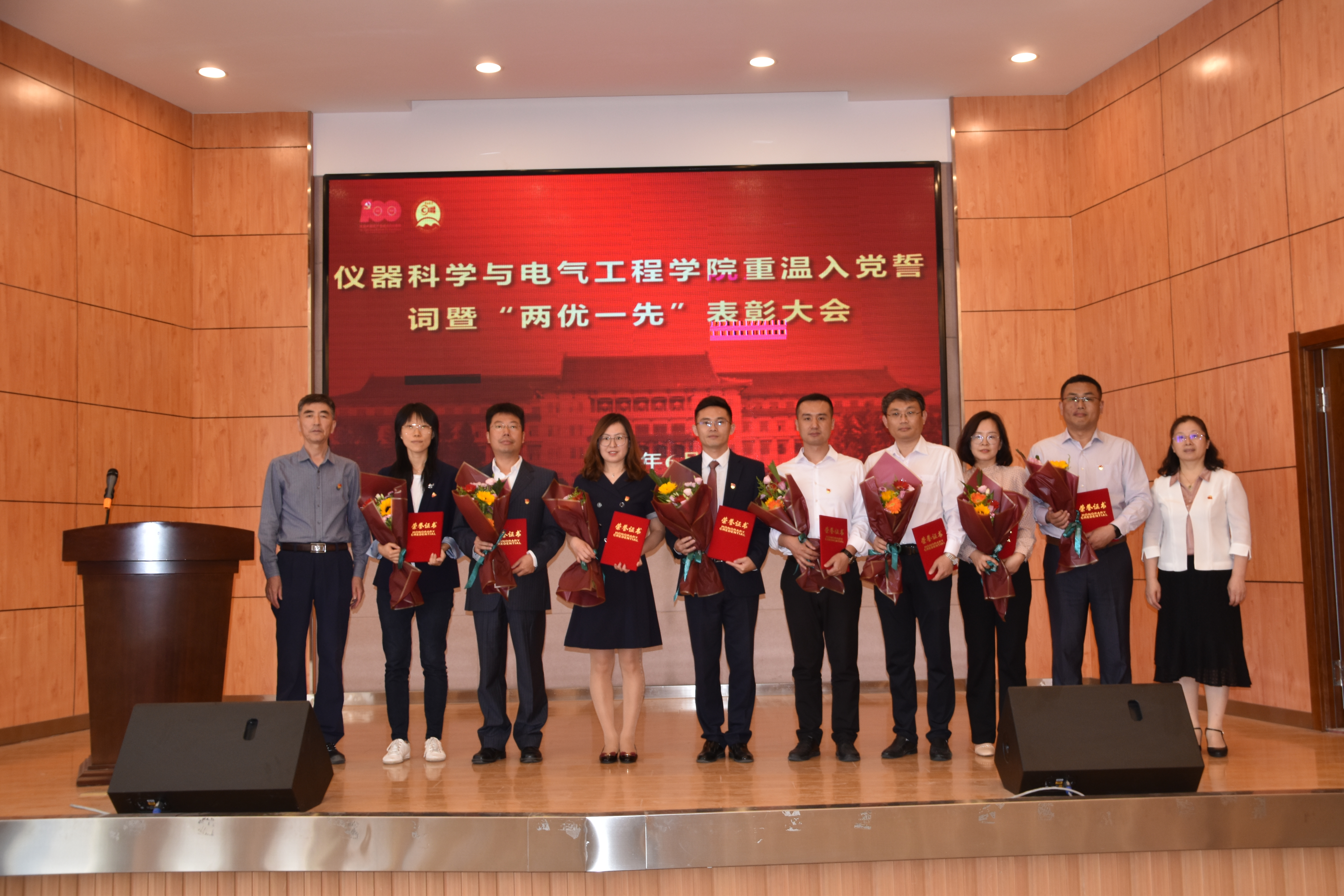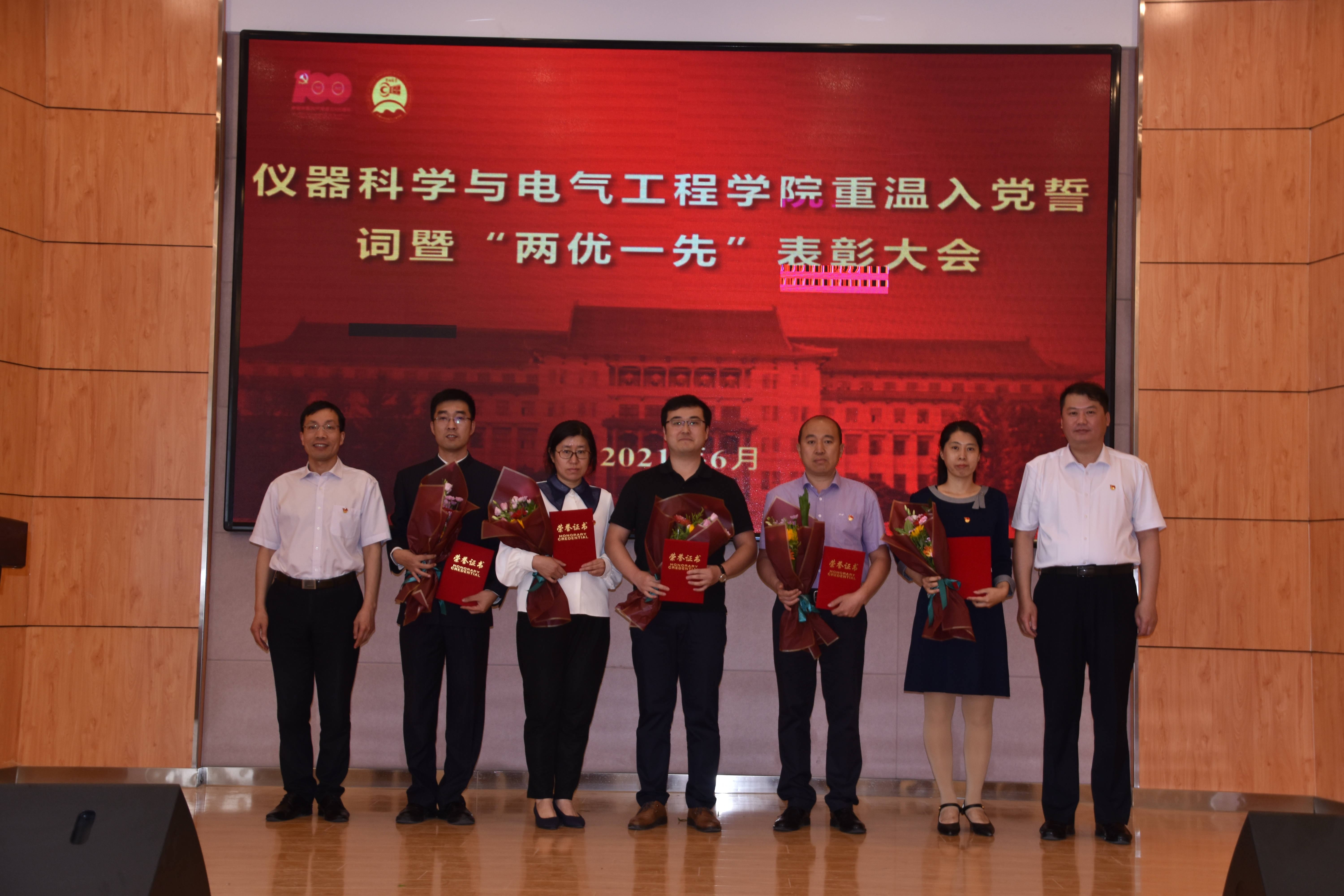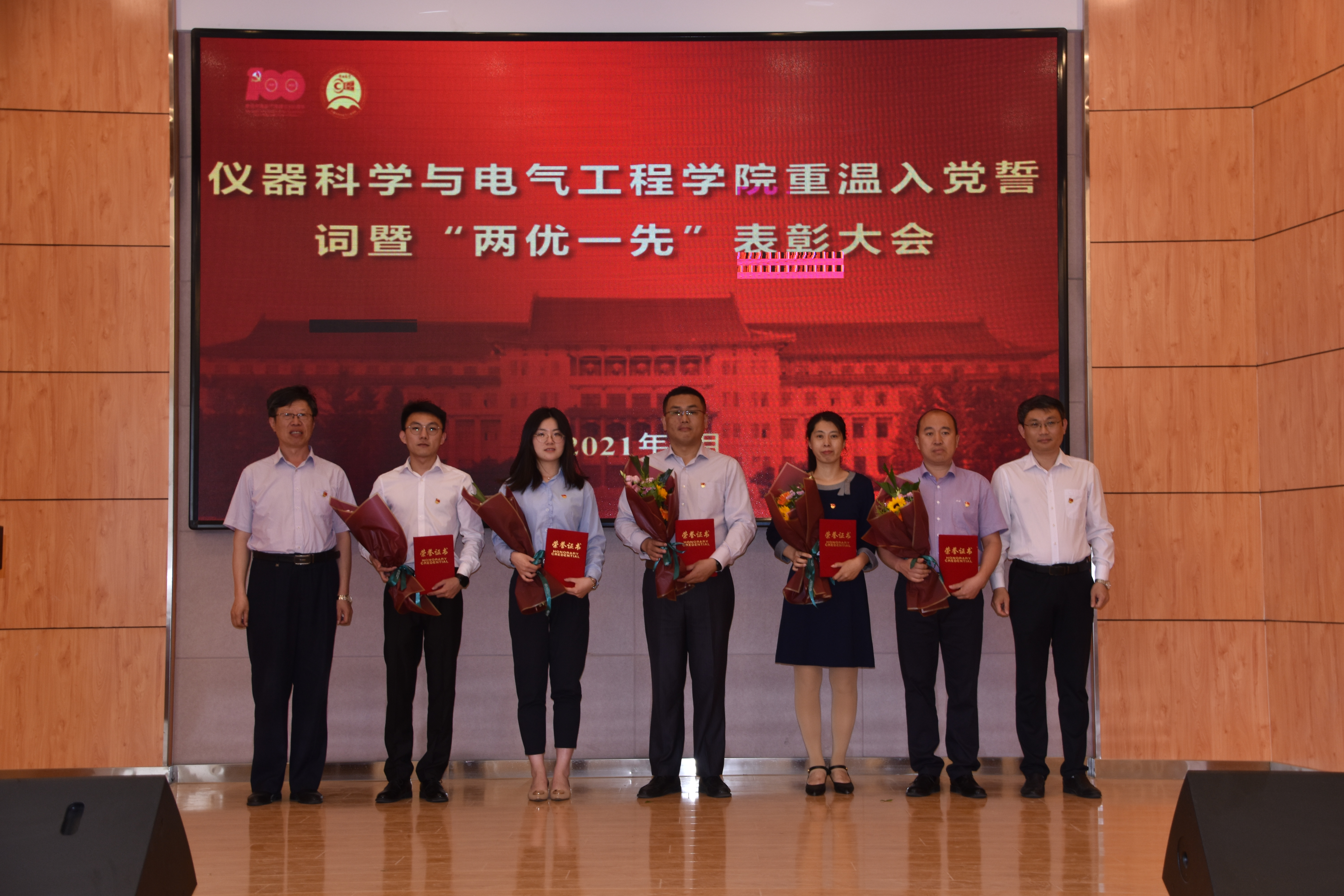 与电气工程学院党委书记邱增凯与党委委员陈祖斌为获得“优秀党务工作者”荣誉称号的6名突出个人颁发证书及鲜花;一色